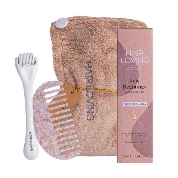 4-Schritte-Haarpflege-Set für die Zeit nach der Geburt! Repariert geschädigtes Haar auf natürliche Weise. Rizinus- und Jojobaöl verleihen dem Haar neue Fülle. Enthält Öl, Handtuchwickel, Dermaroller und Entwirrungskamm. Bekämpft Haarausfall und fördert das Haarwachstum.