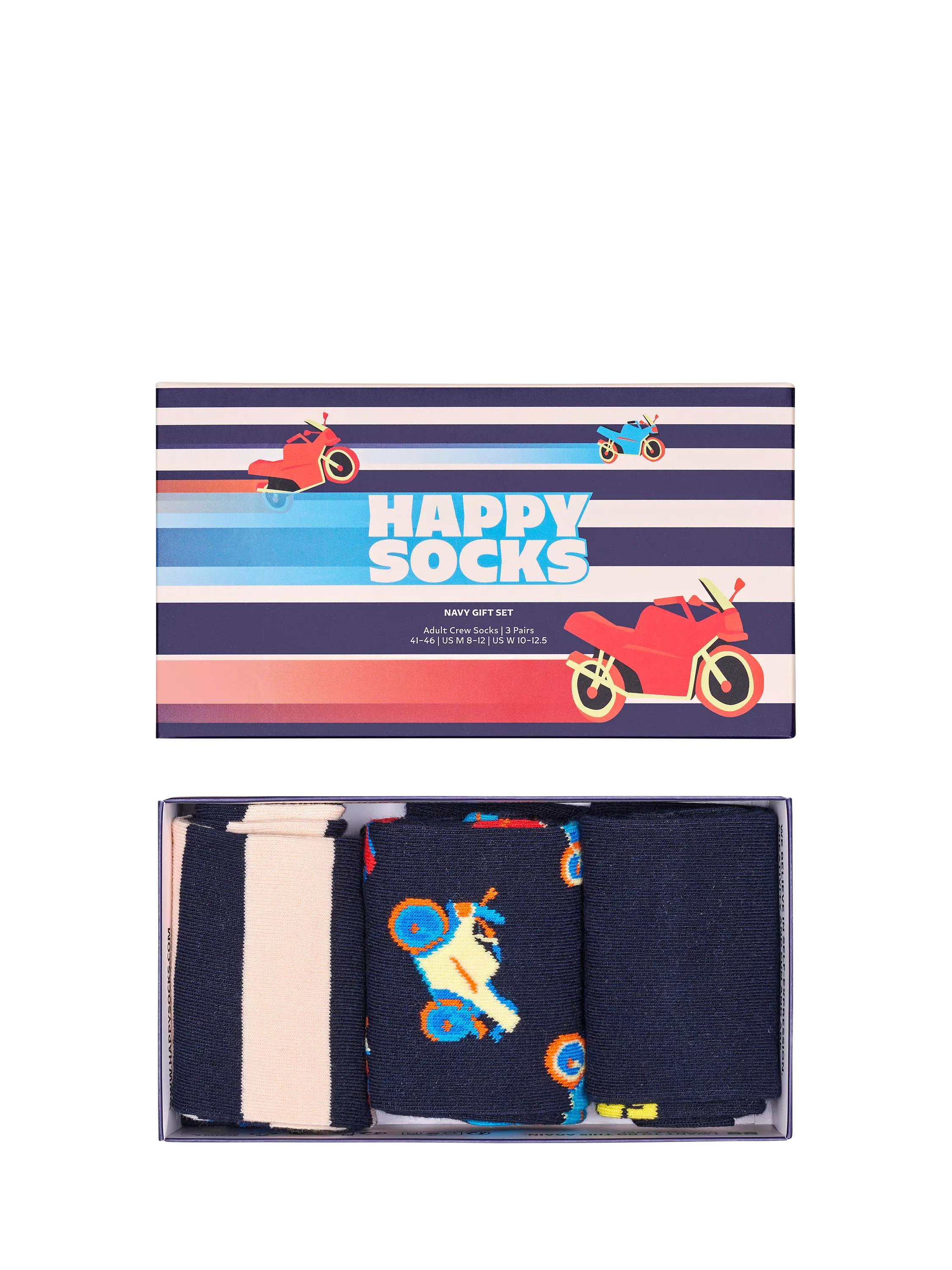 Fröhliche Socken machen Ihre Füße glücklich! Schwing dich aufs Rad und genieße eine Spritztour mit diesen Socken in dem perfekten Blauton. Dieses Geschenkset enthält drei Paar tiefblaue Socken: ein Paar einfarbig, ein Paar gestreift und ein Paar mit Motorradmotiven!