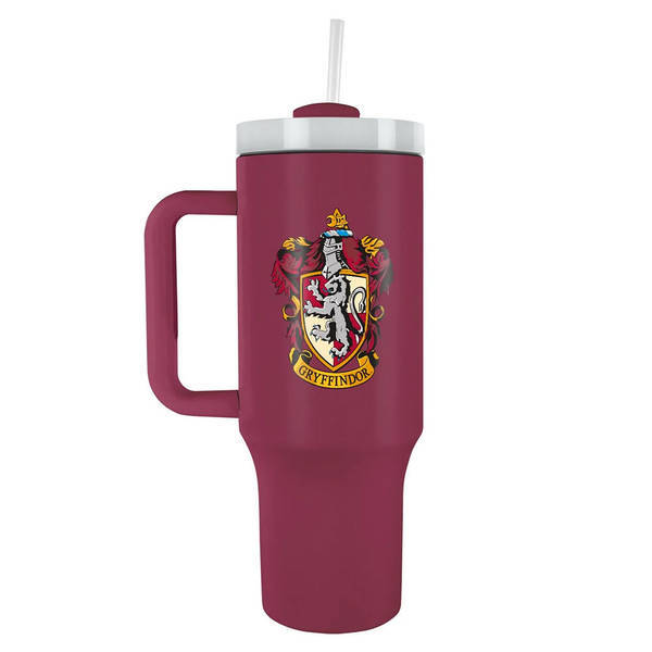 Robust. Höhe: 27 cm. Breite: 10 cm. Design: Wappen, Gryffindor, bedruckt. Doppelwandig, mit Griff, isoliert, hält Getränke kalt und warm, Soft-Touch-Oberfläche, Ausgießdeckel, Thermoskanne.
