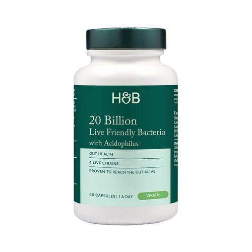 Holland & Barrett Live Friendly Bacteria Capsules deliver a high strength formulation featuring 20 billion active bacteria cultures. This supplement specifically targets and supports normal gut health function within the digestive system. It is made to be suitable for individuals who adhere to vegetarian and vegan dietary requirements.