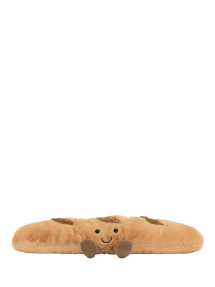 Das Amuseables Baguette ist direkt aus dem kuscheligen Ofen zu Ihnen gehüpft! Dieses goldgelbe Brot ist herrlich weich, mit einem kuscheligen Teig, dicken Kordelschnitten, einem fröhlichen Lächeln und kakaofarbenen Kordelstiefeln.