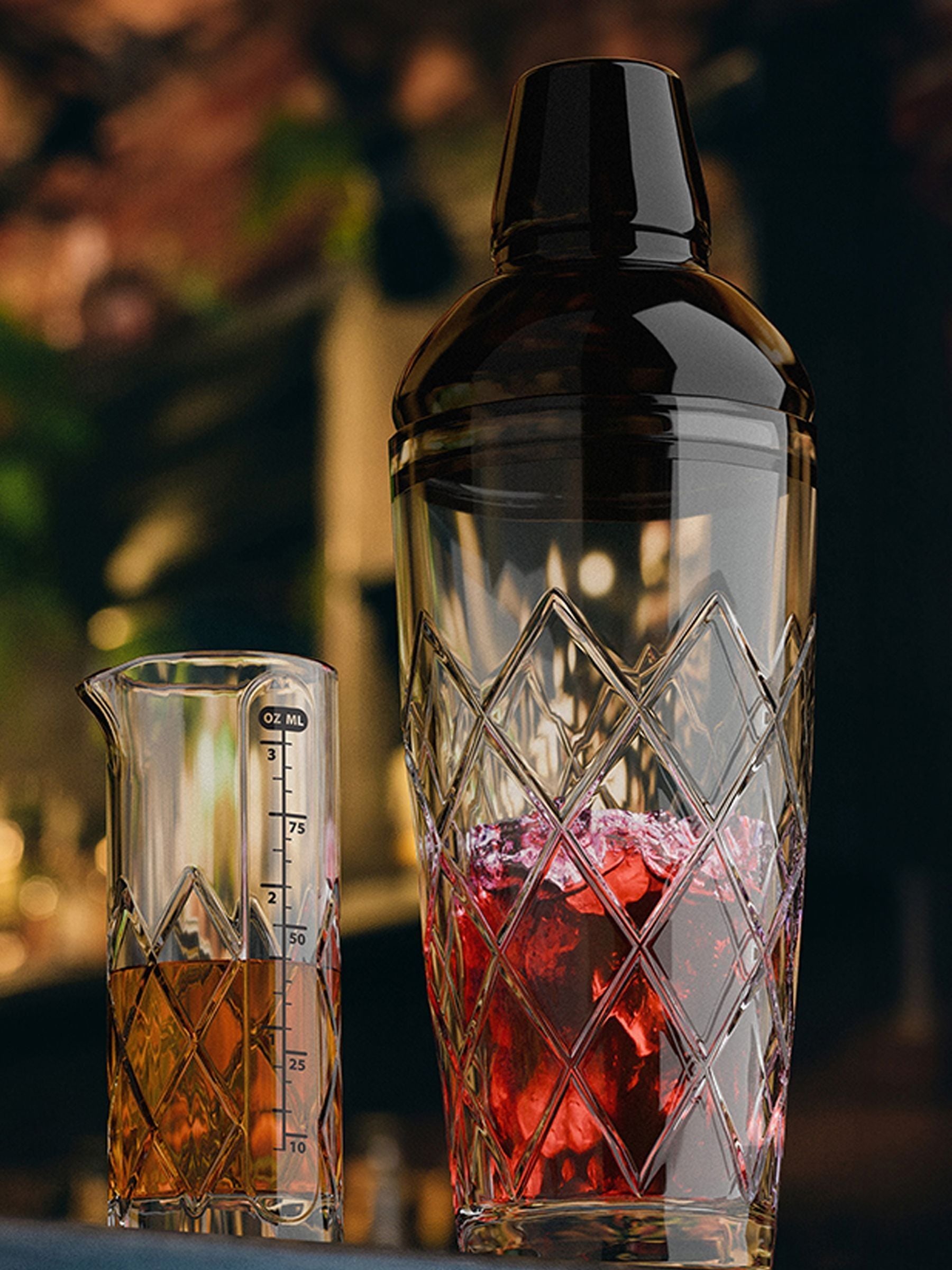 Verfeinern Sie Ihre Cocktailzubereitung mit dem eleganten Yarai Cocktail-Shaker-Set. Dieses Set vereint Form und Funktion und besticht durch das ikonische, japanisch inspirierte Yarai-Webmuster für einen sicheren und stilvollen Griff. Der Shaker verfügt über einen dickwandigen Glasboden und einen eleganten Deckel aus schwarzem Chrom-Edelstahl mit integriertem Sieb für mühelos gleichmäßiges Ausgießen. Eine auslaufsichere Silikondichtung garantiert kleckerfreies Mixen, egal ob zu Hause oder in der Bar. Mit einem großzügigen Fassungsvermögen von 700 ml (24 oz) eignet er sich ideal zum Mixen mehrerer Portionen gleichzeitig. Ebenfalls enthalten ist ein präziser Messbecher mit klarer Skala in Millilitern und Unzen bis 90 ml (3 oz) und praktischem Ausgießer für tropffreies Ausgießen. Wie der Shaker ist auch der Messbecher aus robustem, schwerem Glas gefertigt und mit dem eleganten Yarai-Muster verziert – für einen harmonischen und zeitlosen Look. Hauptmerkmale: • Elegantes & funktionales Design: Dickwandiger Glasshaker mit Yarai-Muster für besseren Halt, kombiniert mit einem Deckel aus schwarzem Chrom-Edelstahl und integriertem Sieb. • Auslaufsicher & großzügiges Fassungsvermögen: Silikondichtung verhindert Verschütten; 700 ml Fassungsvermögen ideal für mehrere Cocktails. • Präziser Messbecher: Klare Messmarkierungen (ml & oz) bis 90 ml; Ausgießer ermöglicht sauberes und kontrolliertes Ausgießen. • Langlebig & stilvoll: Hochwertige Materialien für lange Haltbarkeit, mit einem anspruchsvollen, professionellen Erscheinungsbild. Komplettes Set beinhaltet: • 1 Shakerglas • 1 Shakerdeckel aus schwarzem Chrom-Edelstahl mit Verschlusskappe • 1 Messbecher aus Glas mit Yarai-Muster Spezifikationen: • Abmessungen Shaker: 9,4 x 9,4 x 26 cm • Abmessungen Messbecher: 4,7 x 4,7 x 11,8 cm • Fassungsvermögen: Shaker – 700 ml | Messbecher – 100 ml • Materialien: Schwarzer Chrom-Edelstahl & dickes Glas