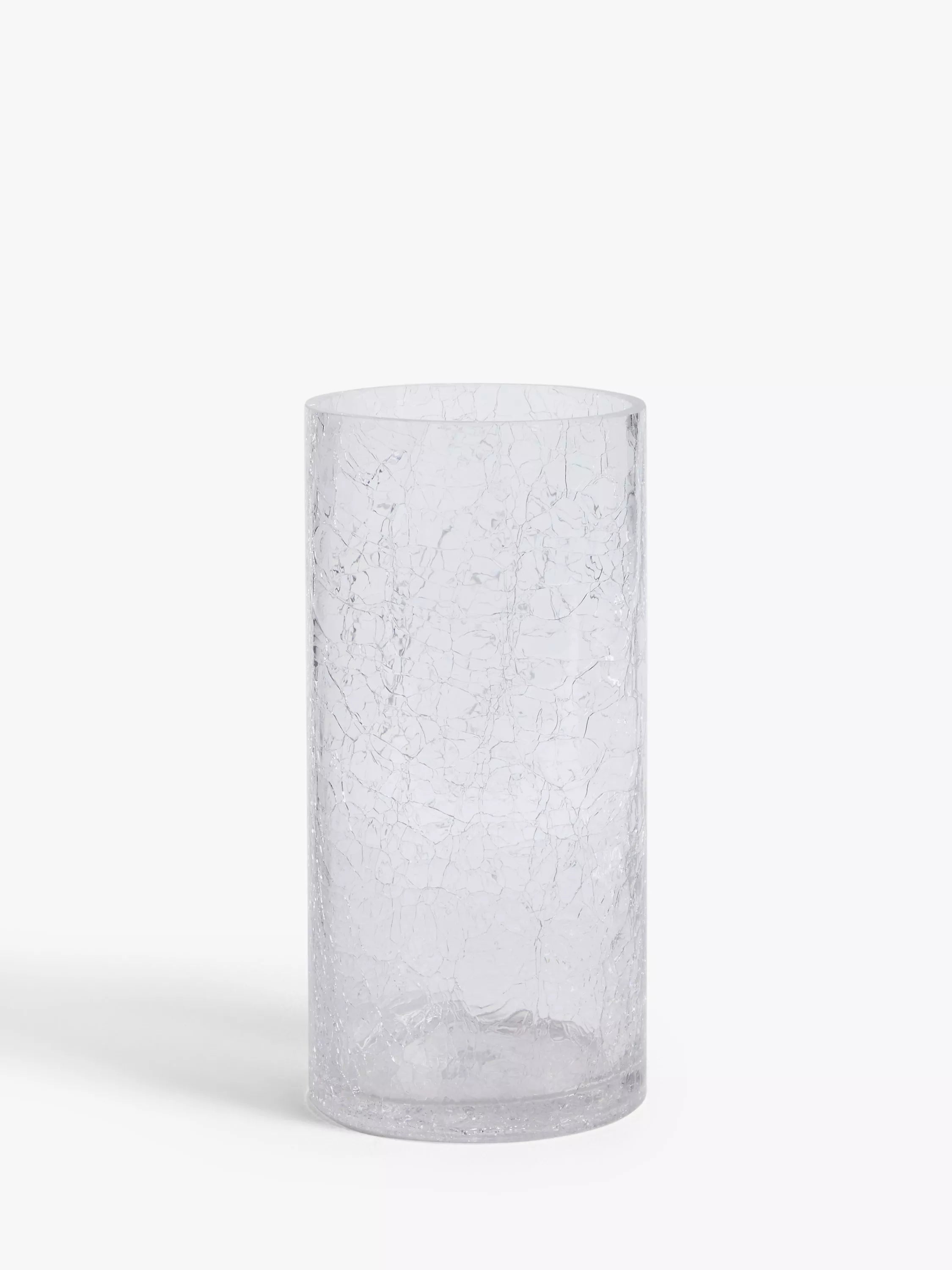 Unsere Crackle-Vase hat eine klassische Zylinderform und eignet sich perfekt für die Präsentation hoher Blüten. Das Glas ist mundgeblasen und mit unregelmäßigen Rissen versehen, als wäre es zerbrochen und wieder zusammengesetzt worden.