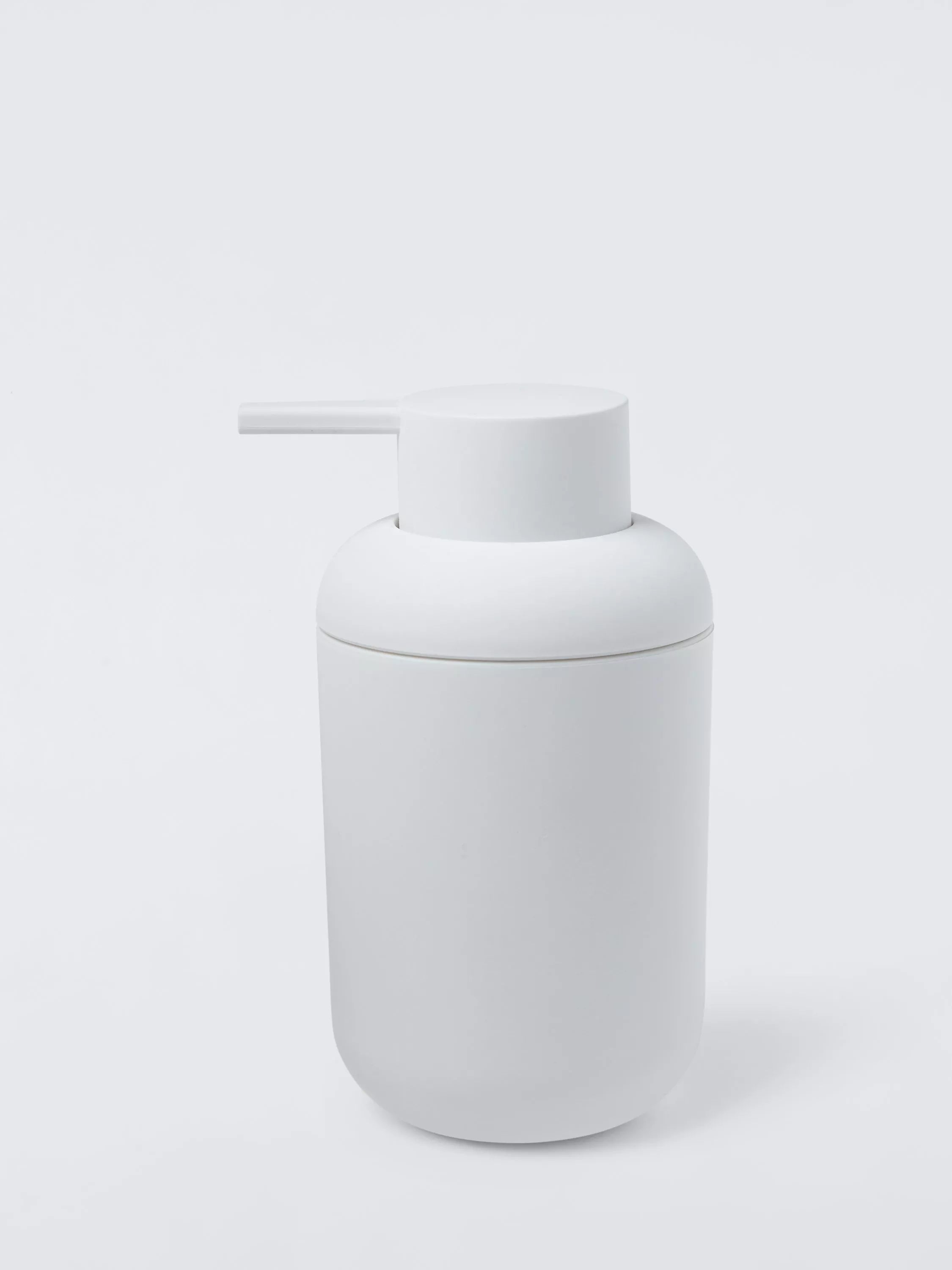 Ein preiswerter Seifenspender aus Kunststoff mit abgerundetem Design, perfekt für Badezimmer oder Küche.