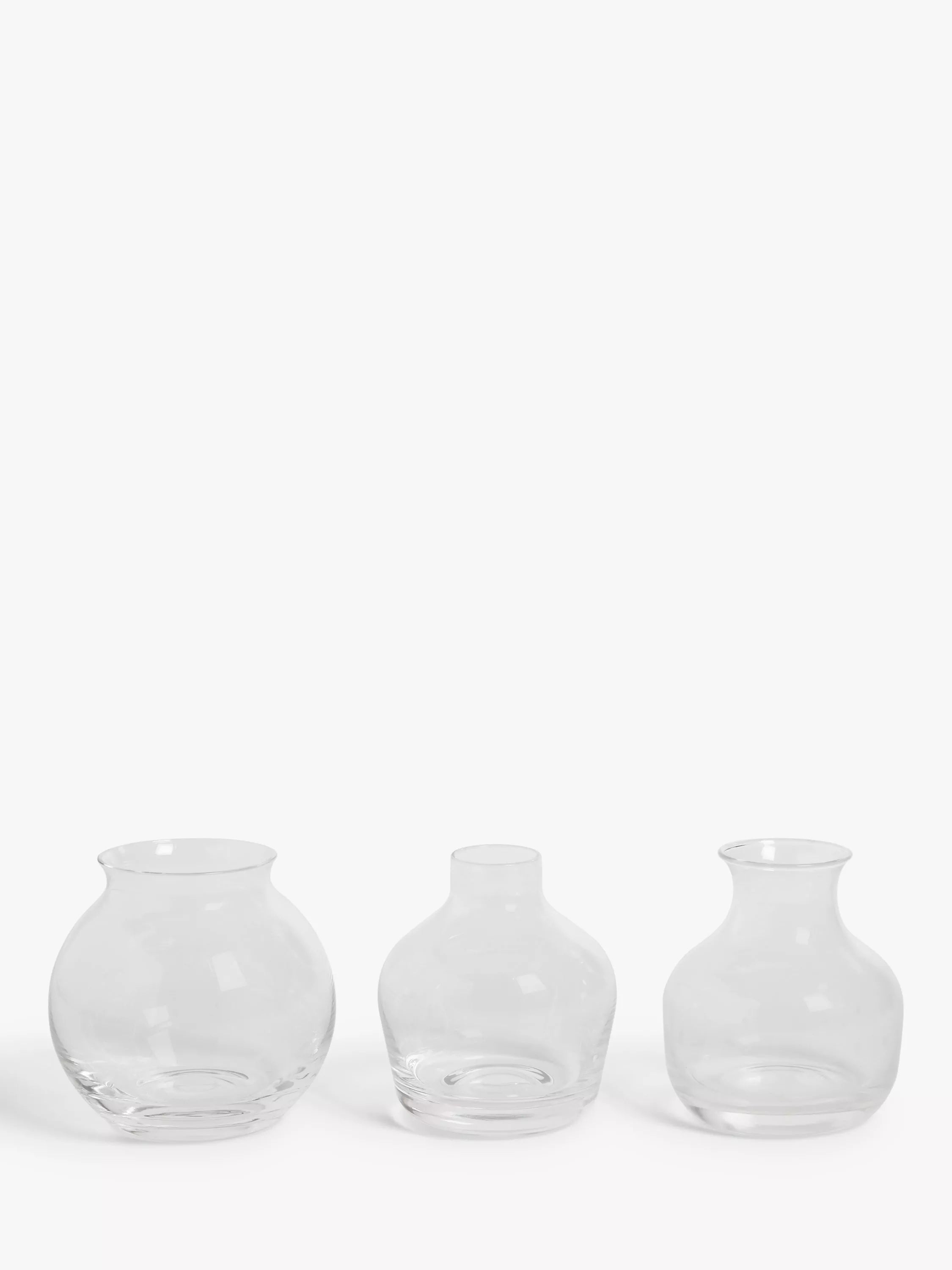 Drei Glasvasen in verschiedenen Formen, eine für Stiel- und eine für Knospenblumen. Ideal zur Kombination mit Einzelblumenarrangements oder anderen schlichten Blumengestecken.