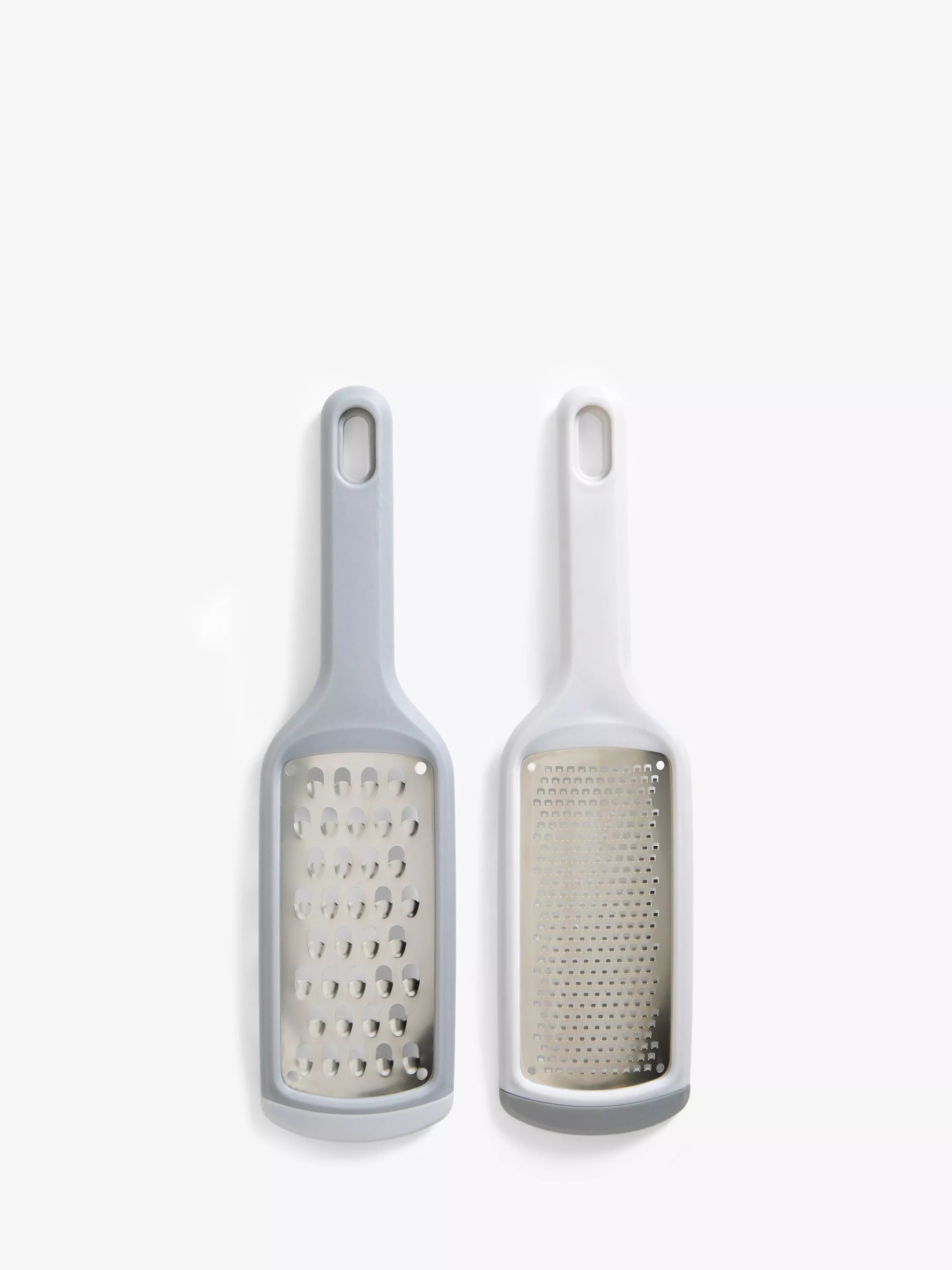 Zwei handliche Reiben, die sich platzsparend zusammenstecken lassen. Beide haben scharfe, säuregeätzte Edelstahlklingen: eine zum groben Reiben von Hartkäse oder Schokolade, die andere zum Reiben von Muskatnuss oder Abreiben von Zitrusschalen – ideal zum Verfeinern von Salaten, Backwaren und vielem mehr.