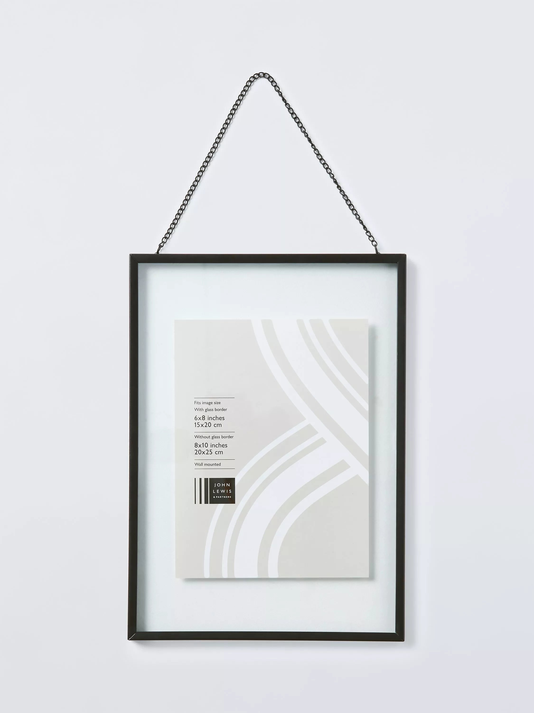 Ein moderner und stilvoller Rahmen, der Ihr Foto oder Kunstwerk scheinbar zwischen zwei Glasscheiben schweben lässt. Der Rahmen wird an einer Kette aufgehängt und ist somit ein echter Blickfang für Ihr Zuhause.