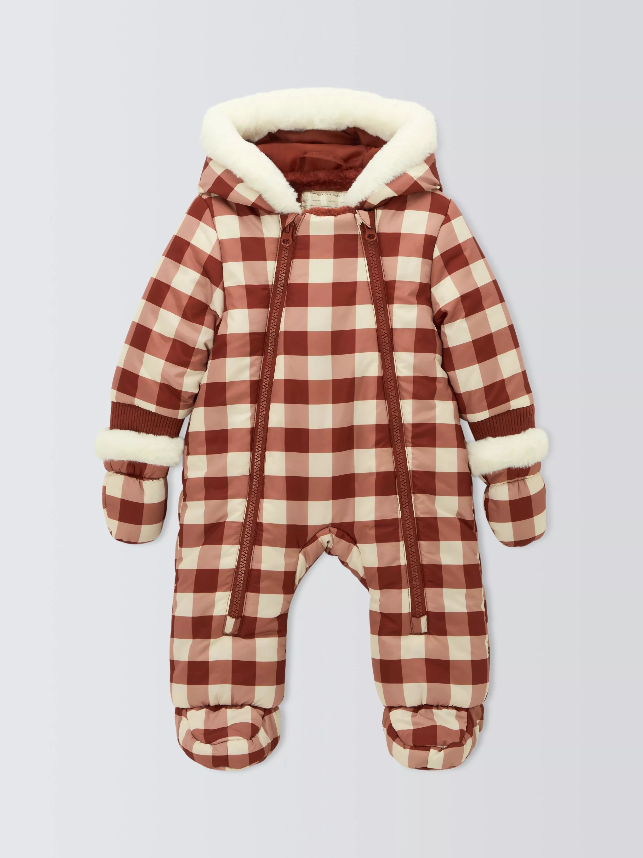 Baby-Schneeanzug mit durchgehendem Karomuster und Steppung. Mit zwei Reißverschlüssen, Kunstfellfutter und Kapuzenbesatz.