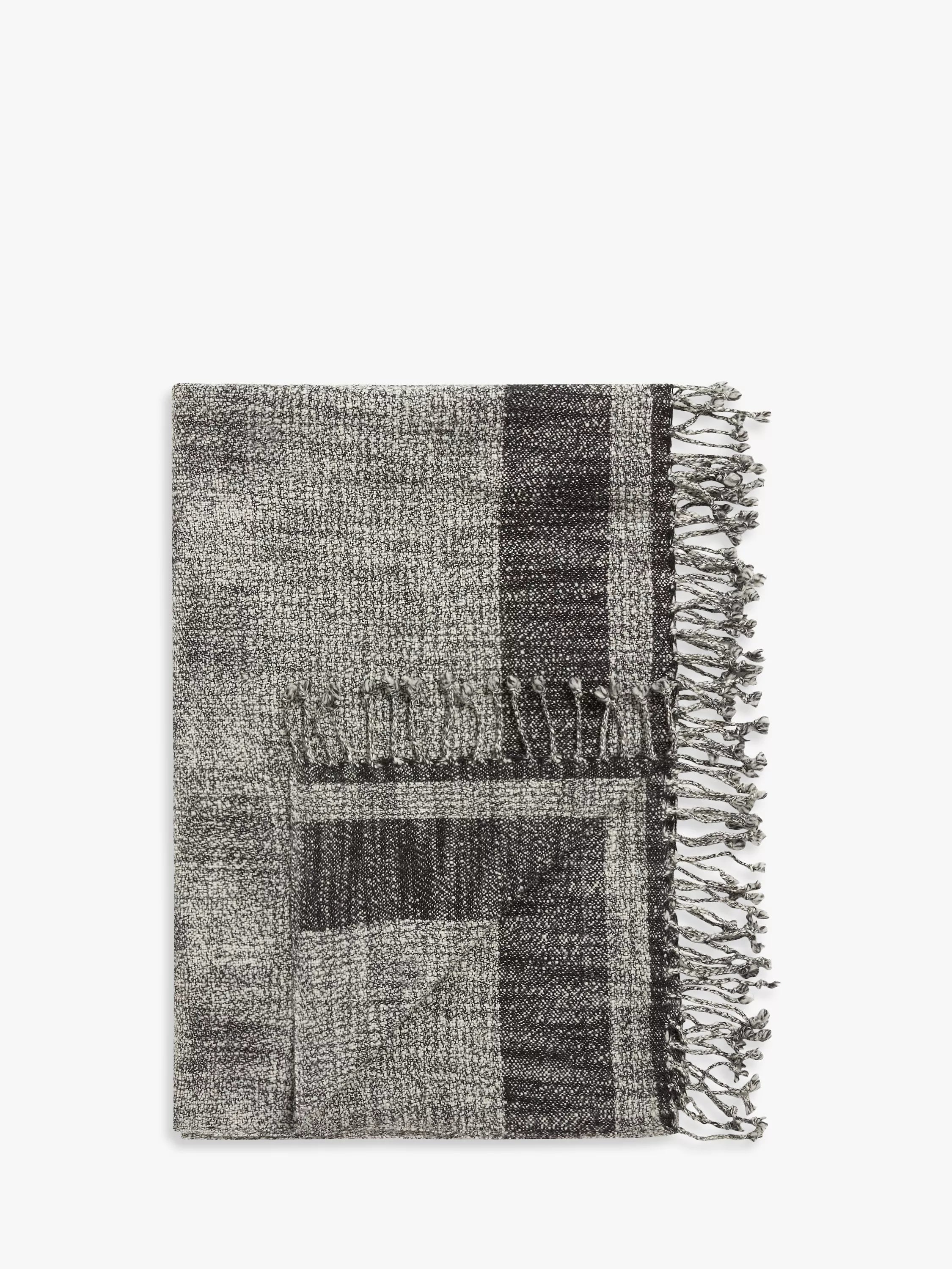 Diese leichte Decke aus melierter Wolle besticht durch wunderschöne Tonabstufungen in Schwarz- und Weißtönen und ist mit einem Fransenrand versehen.