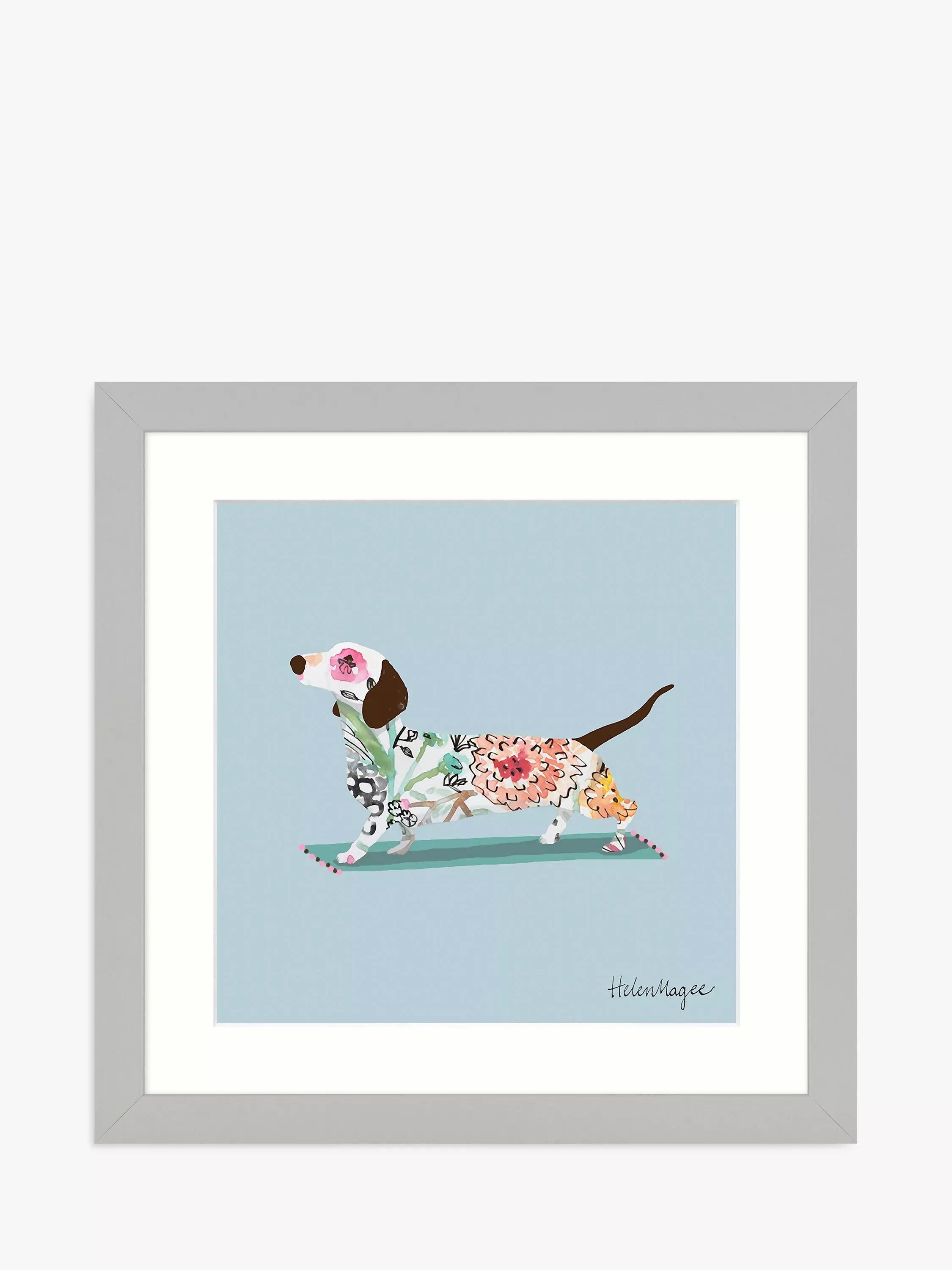 A colourful sausage dog in a floral design, framed with a mount, by artist Helen Magee.