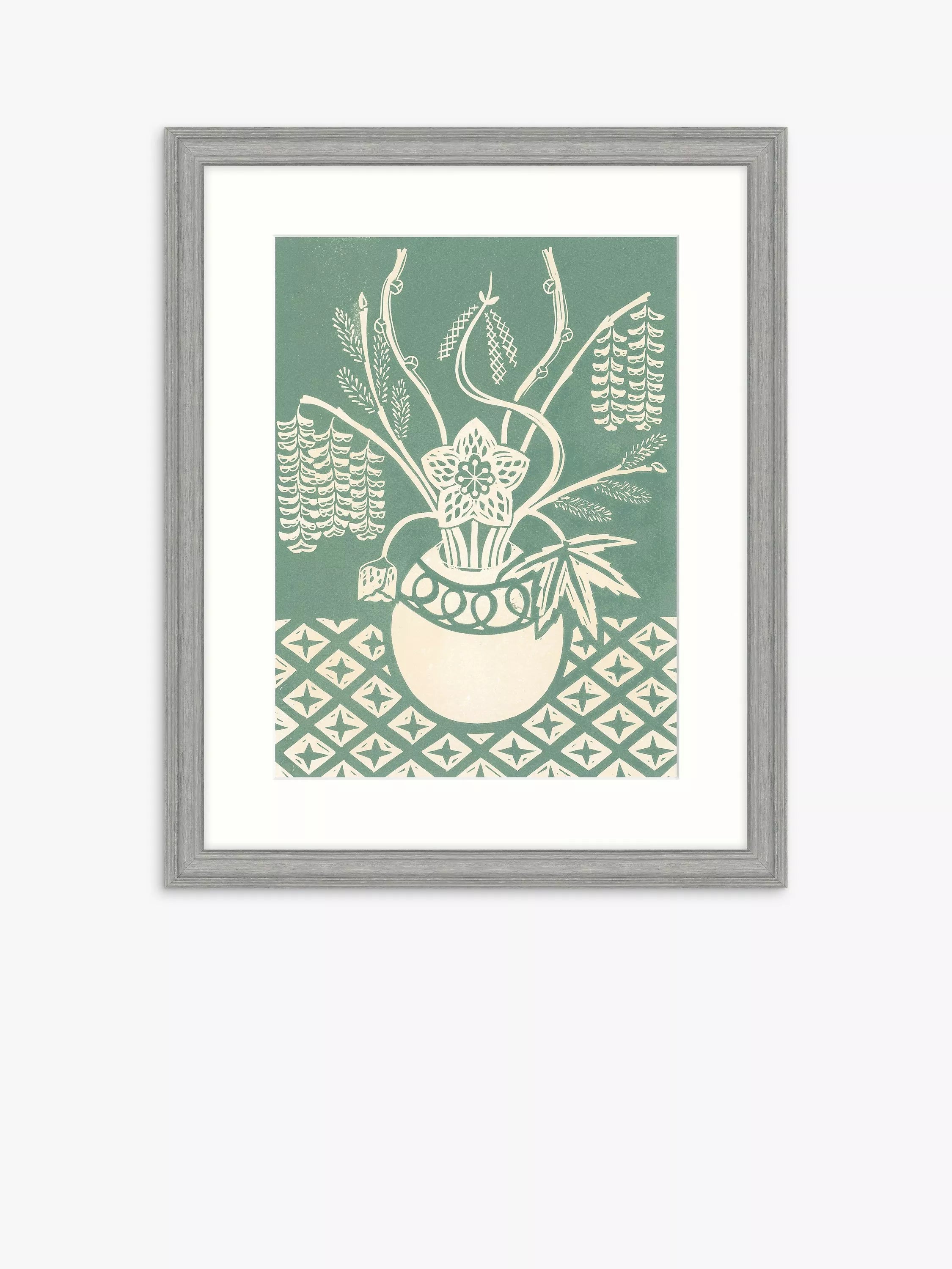 Ein moderner Blumendruck von Kate Millbank. Der Druck ist verglast und in einem Passepartout mit Holzoptik gerahmt, sodass er sofort an die Wand gehängt werden kann.