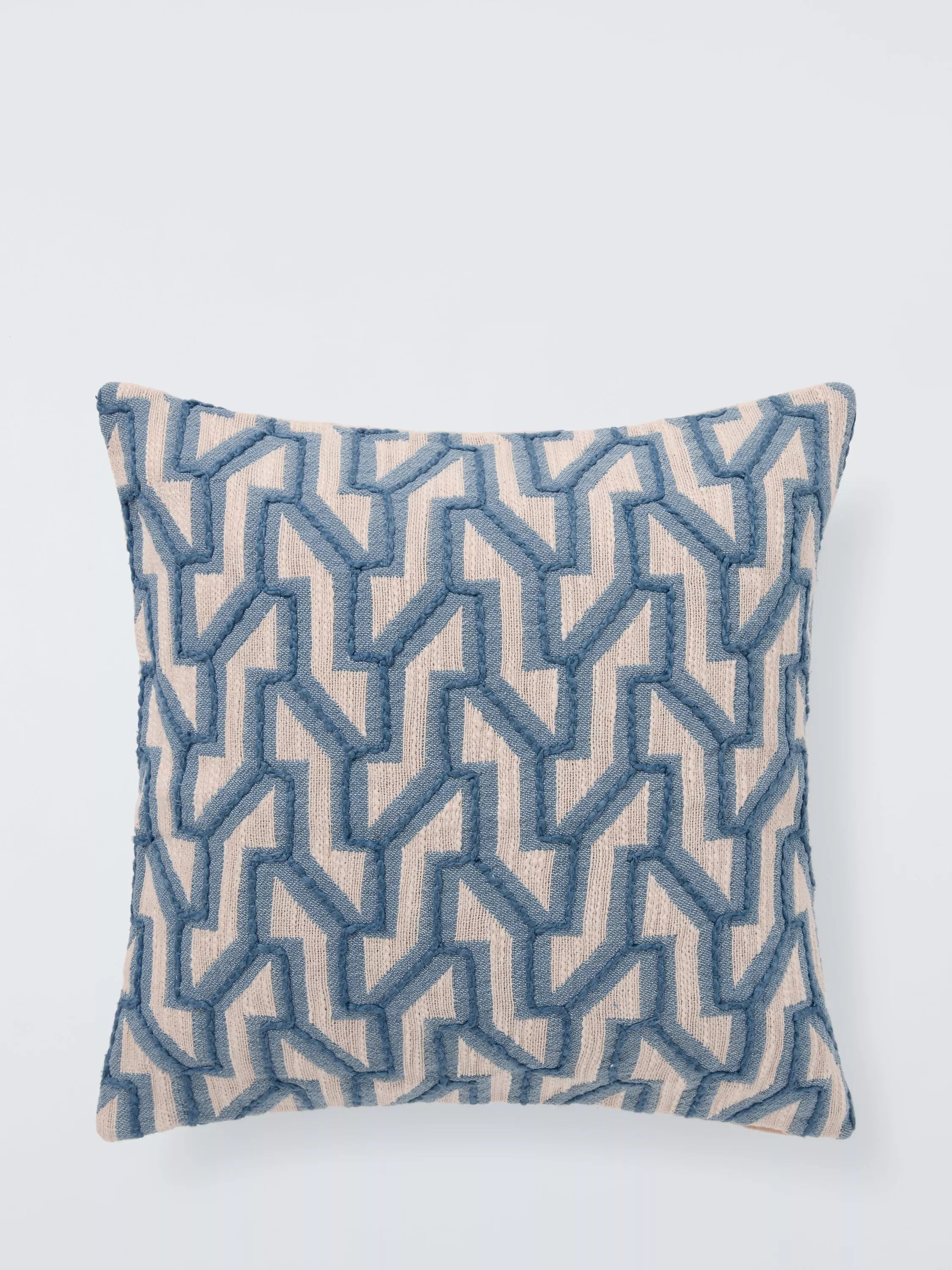 Ein faszinierendes, ineinandergreifendes Webmuster wird durch zusätzliche Stickreihen hervorgehoben, wodurch ein modernes, geometrisches Kissen entsteht, das in einem modernen Ambiente hervorragend aussieht.
