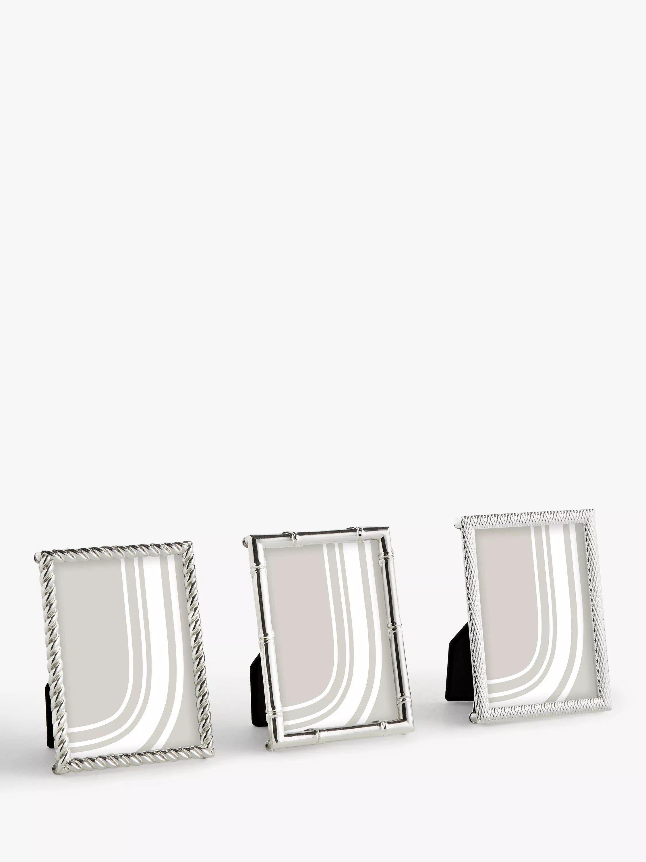 Ein Set aus drei Mini-Fotorahmen in verschiedenen silbernen Designs, die perfekt zueinander passen. Jeder Rahmen kann sowohl vertikal als auch horizontal aufgestellt werden. Das Set wird in einer Geschenkbox geliefert und ist somit ein ideales Geschenk für Hochzeiten, Jubiläen und andere Anlässe.