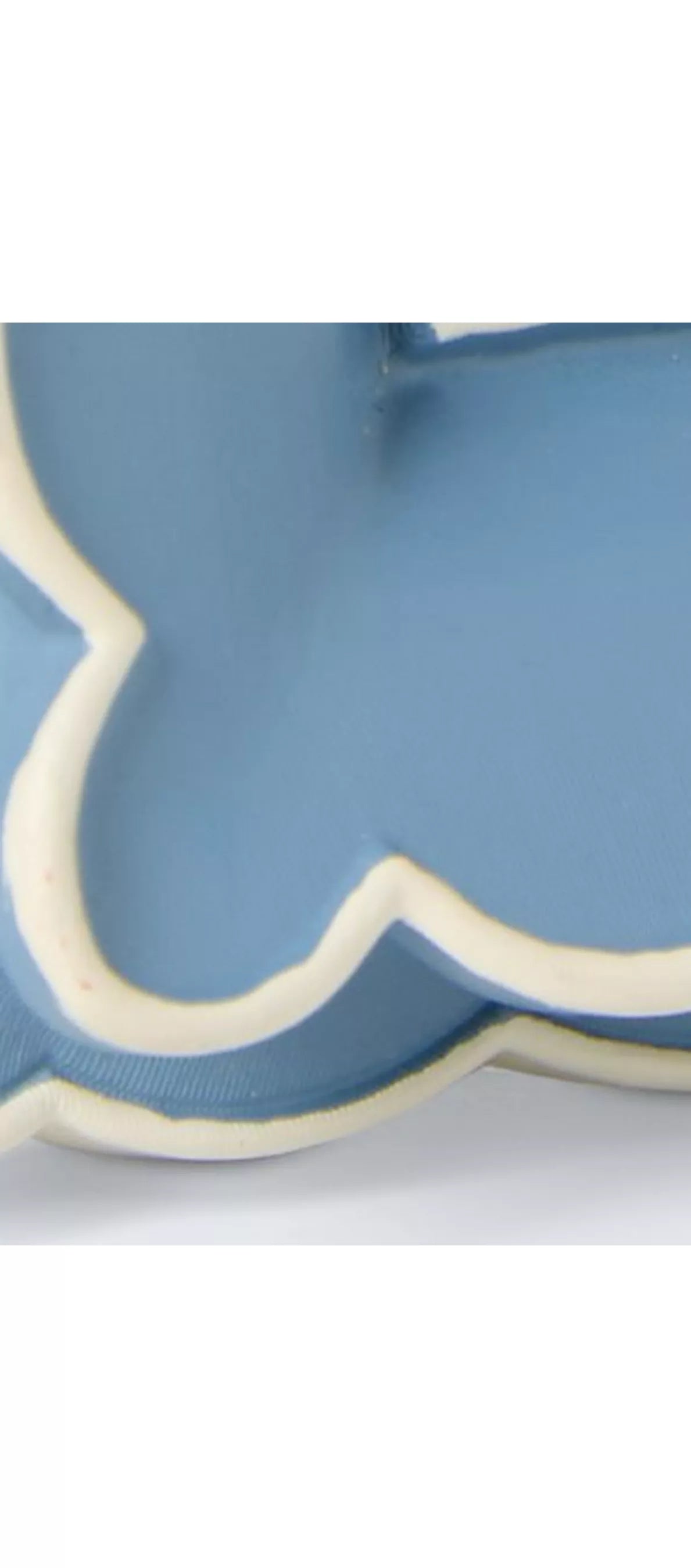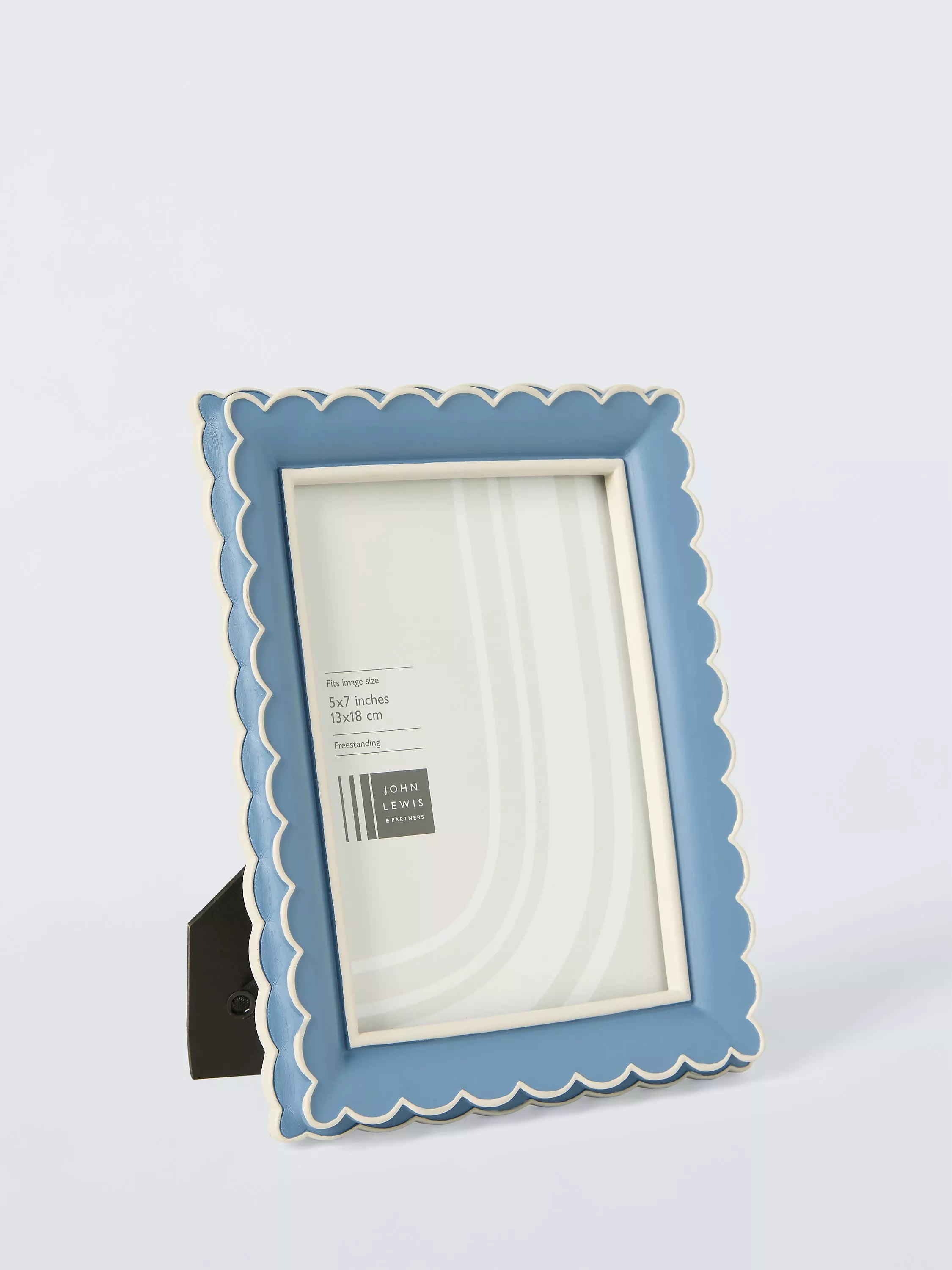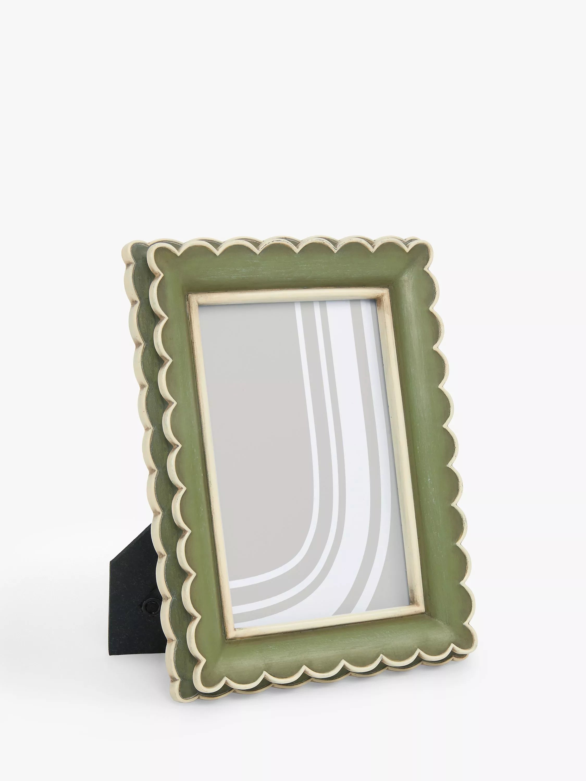 Dieser muschelförmige Bilderrahmen mit kontrastierender Umrandung ist handbemalt und mit einer Samtrückseite versehen. Er kann freistehend, vertikal oder horizontal aufgestellt werden.