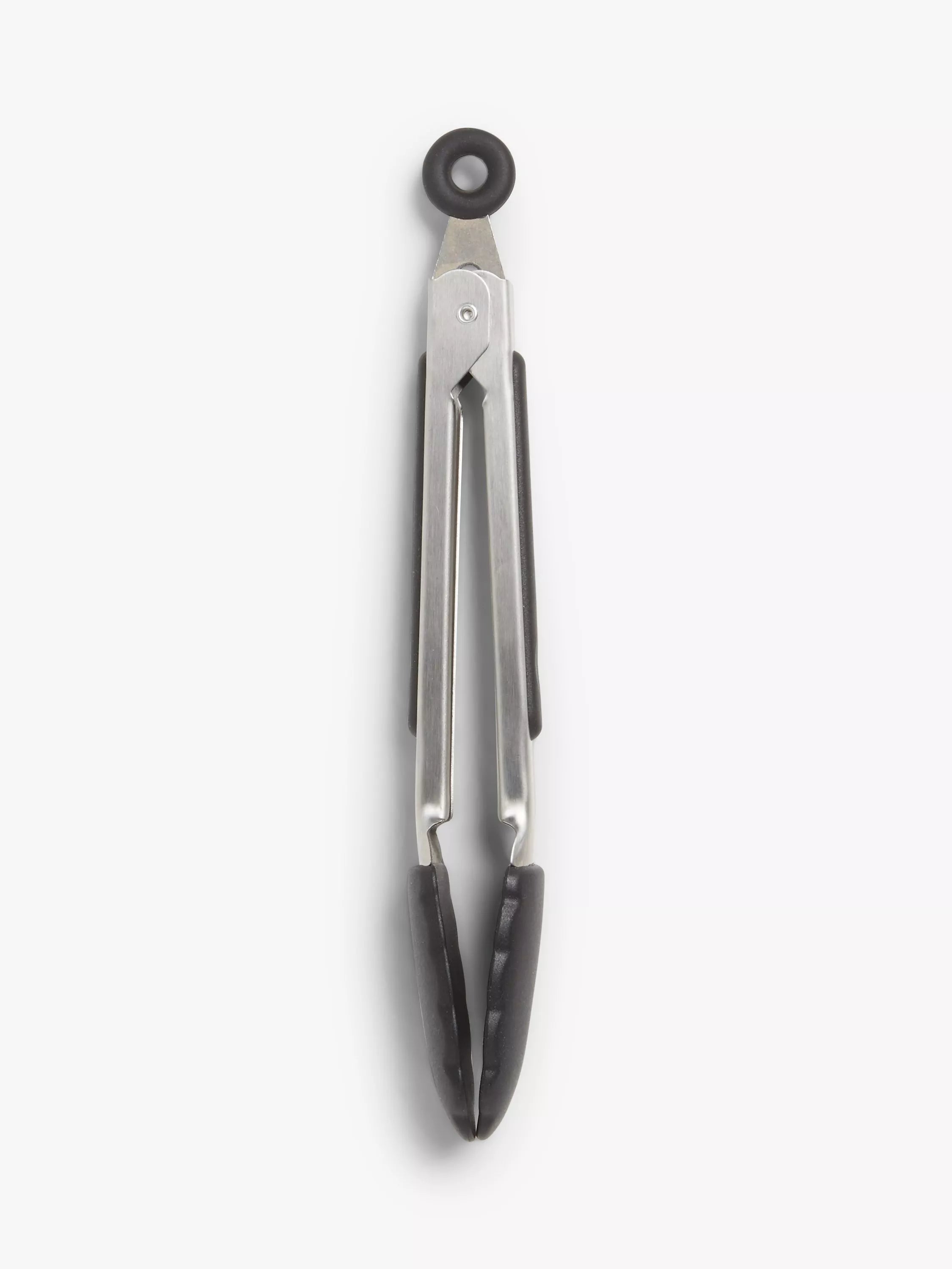 A pair of kitchen tongs made of durable stainless steel with a soft grip for comfortable holding. Dishwasher safe, they're easy to clean. The silicone tong ends are heat-resistant and safe to use with non-stick pots and pans.