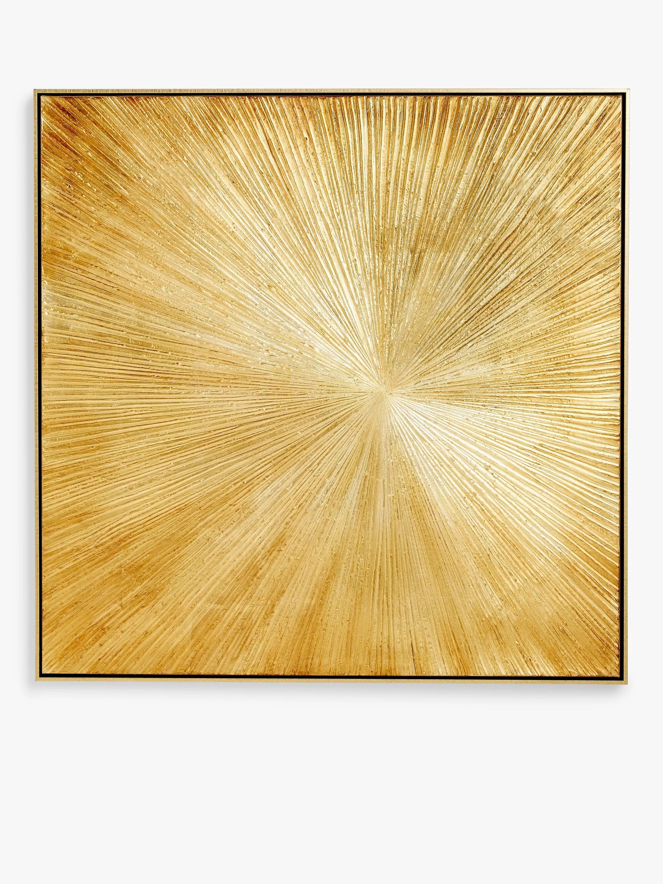 Ein großformatiger Leinwanddruck im abstrakten Sternenmuster in warmen Farbtönen mit dem Titel „Temptation“. Der Rahmen in Metalloptik ermöglicht dank der D-Ring-Aufhängung auf der Rückseite eine einfache Wandmontage.