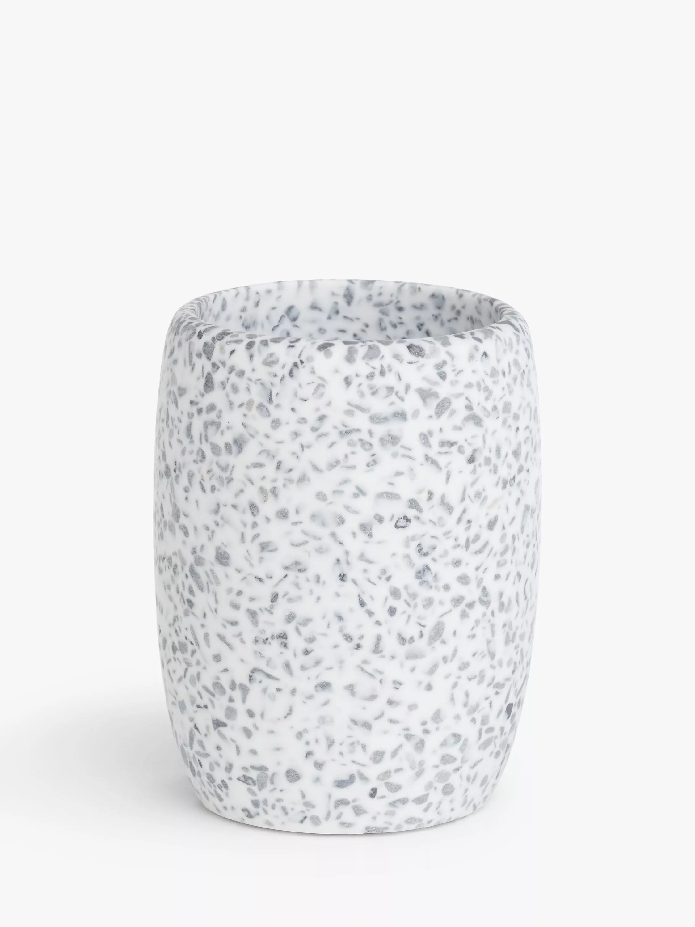 Dieser aus Kunstharz gefertigte Badezimmerbecher in Terrazzo-Optik besticht durch sein gesprenkeltes, fast mosaikartiges Steinmuster, das Ihrem Badezimmer eine natürliche, strukturierte Note verleiht.