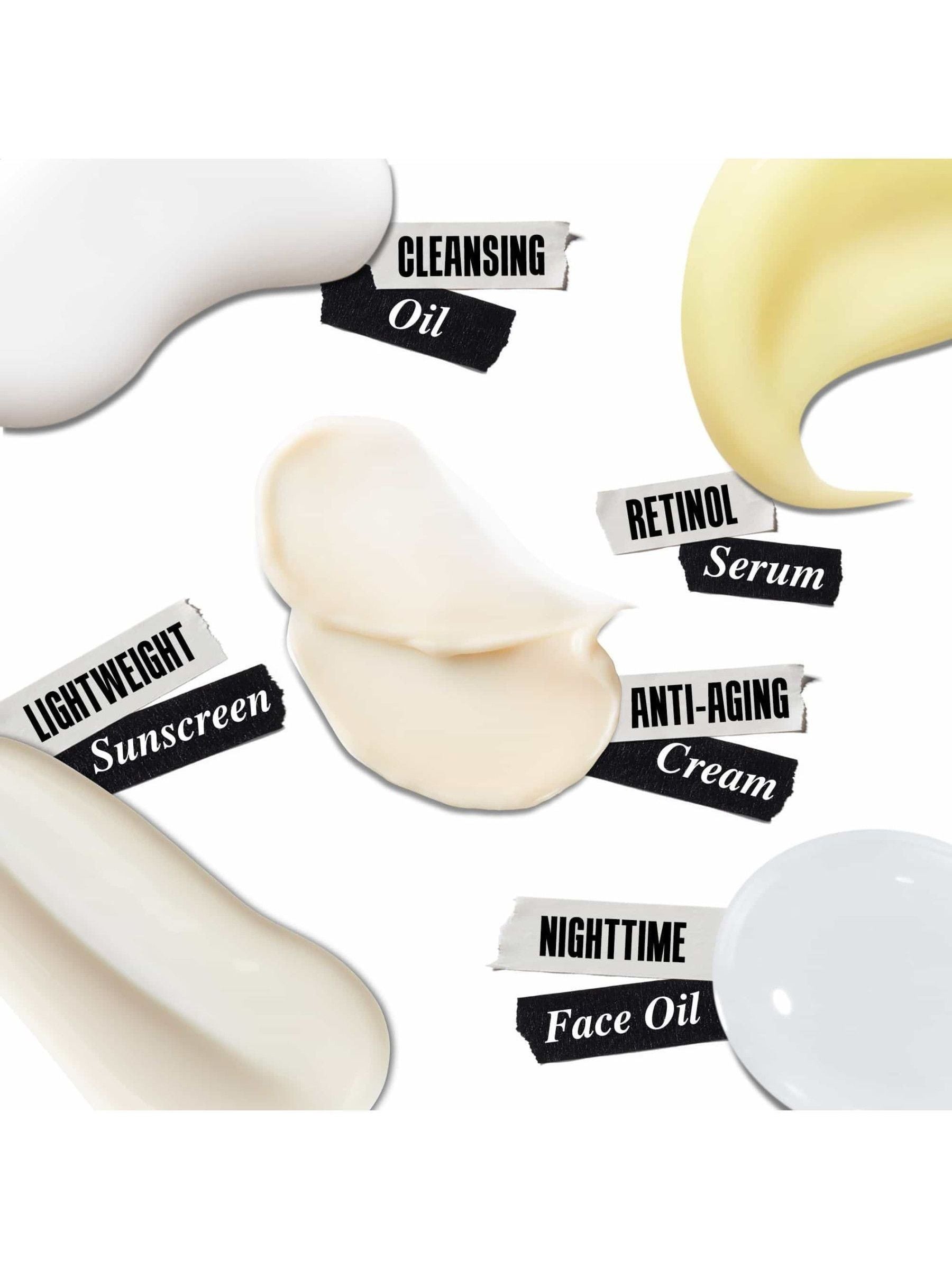 Reinigen, pflegen und regenerieren Sie Ihre Haut für ein jugendlicheres Aussehen mit diesem ultimativen Nachtpflege-Set. Es enthält fünf wirksame Hautpflege-Favoriten mit kraftvollen Inhaltsstoffen wie reinem Retinol und Squalan. Dieses Set hilft sichtbar, feine Linien zu reduzieren, die Hautstruktur zu glätten und die Haut bis zum Morgen zu straffen. ANWENDUNG: 3–4 Pumpstöße in die Hände geben und das Öl in die trockene Haut, einschließlich der Augenpartie, einmassieren. Wasser hinzufügen und einmassieren, bis eine Emulsion entsteht. Anschließend mit lauwarmem Wasser abspülen und die Haut trocken tupfen. Das Serum auf das gesamte Gesicht, einschließlich der Augenpartie und der Krähenfüße, auftragen und dabei die Augenpartie aussparen. Anschließend die Creme gleichmäßig auf die Haut auftragen und in Gesicht und Hals einmassieren. 2–3 Tropfen des strahlenden Öls in die Hände geben, sanft in die Haut einklopfen und einmassieren. Morgens und abends eine etwa münzgroße Menge Sonnenschutzmittel mit LSF auf das Gesicht auftragen und dabei die Augenpartie aussparen.