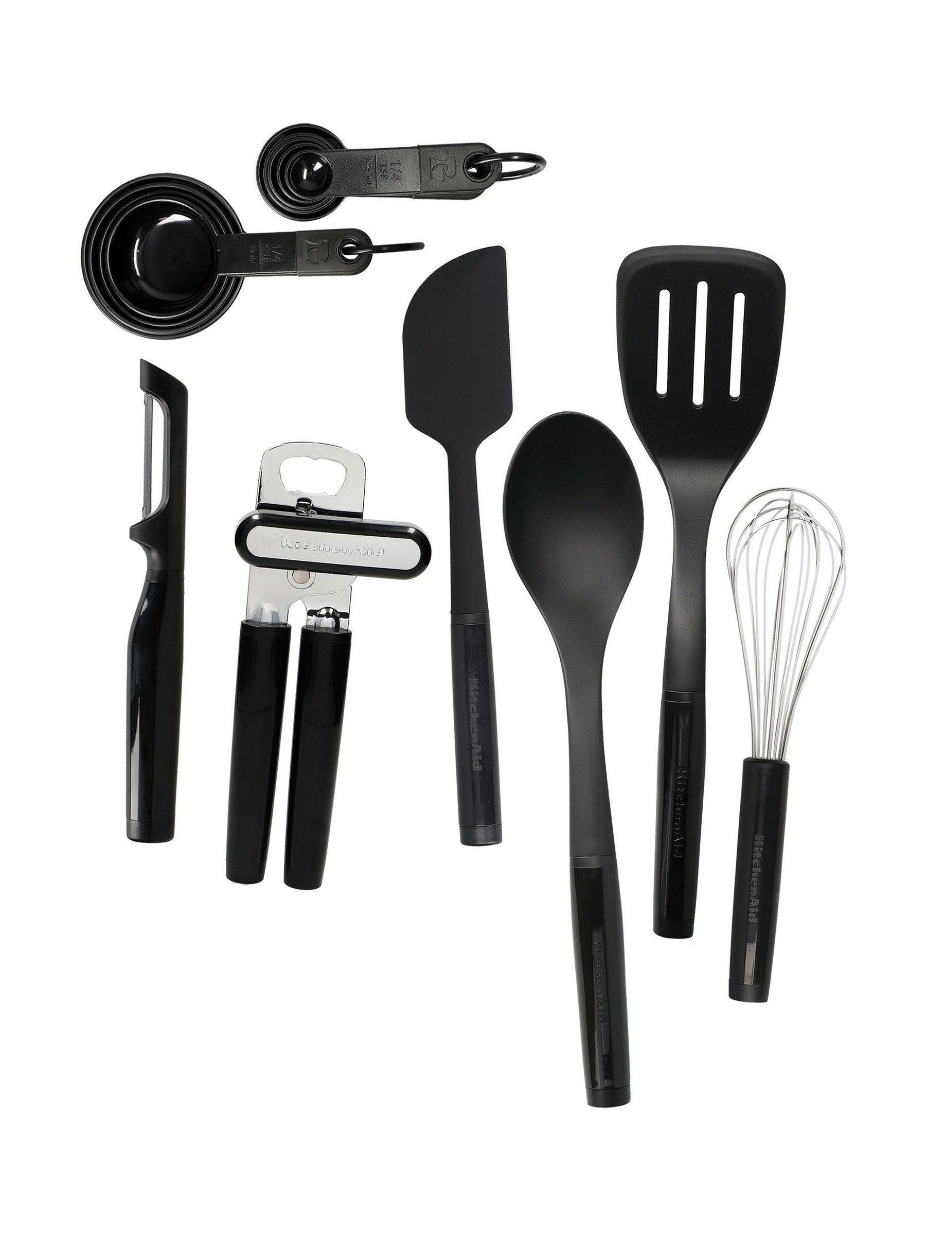 The KitchenAid 15-piece tool and gadget set includes a slotted turner, cooking spoon, scraper spatula, Euro peeler, multi-function can opener and utility whisk, plus a set of four measuring cups and a set of five measure spoons. The tools are made of premium-grade materials, and all except the whisk and can opener are heat resistant to 232C/450F and are safe for non-stick coatings. All products are dishwasher safe for quick and easy cleanup, except for the can opener.