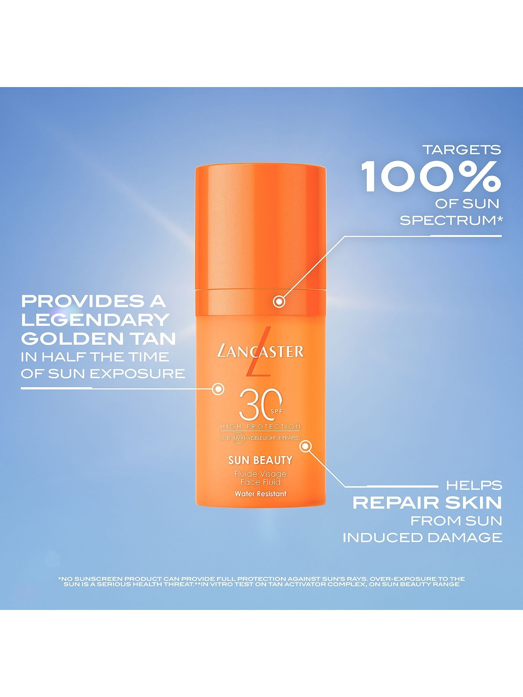 Das Lancaster Sun Beauty Face Fluid SPF30 ist Ihr ultimativer Verbündeter gegen lichtbedingte Hautalterung. Unsere Full Light Technology™ bietet ein 10-fach breiteres Lichtspektrum, während unser Tan Activator Komplex Ihnen in der Hälfte der Zeit eine legendäre, goldene Bräune verleiht. Das ultraleichte und nicht fettende Gesichtsfluid verschmilzt sofort mit der Haut und hinterlässt ein unsichtbares, seidig-glattes, trockenes Finish und ein Gefühl wie ungeschminkte Haut. Es bietet Schutz vor dem gesamten Lichtspektrum und nicht nur vor UVB- und UVA-Strahlen. Kein Sonnenschutzmittel kann einen vollständigen Schutz vor den schädlichen Auswirkungen der Sonnenstrahlen bieten. Übermäßige Sonneneinstrahlung ist ein ernstzunehmendes Gesundheitsrisiko.
