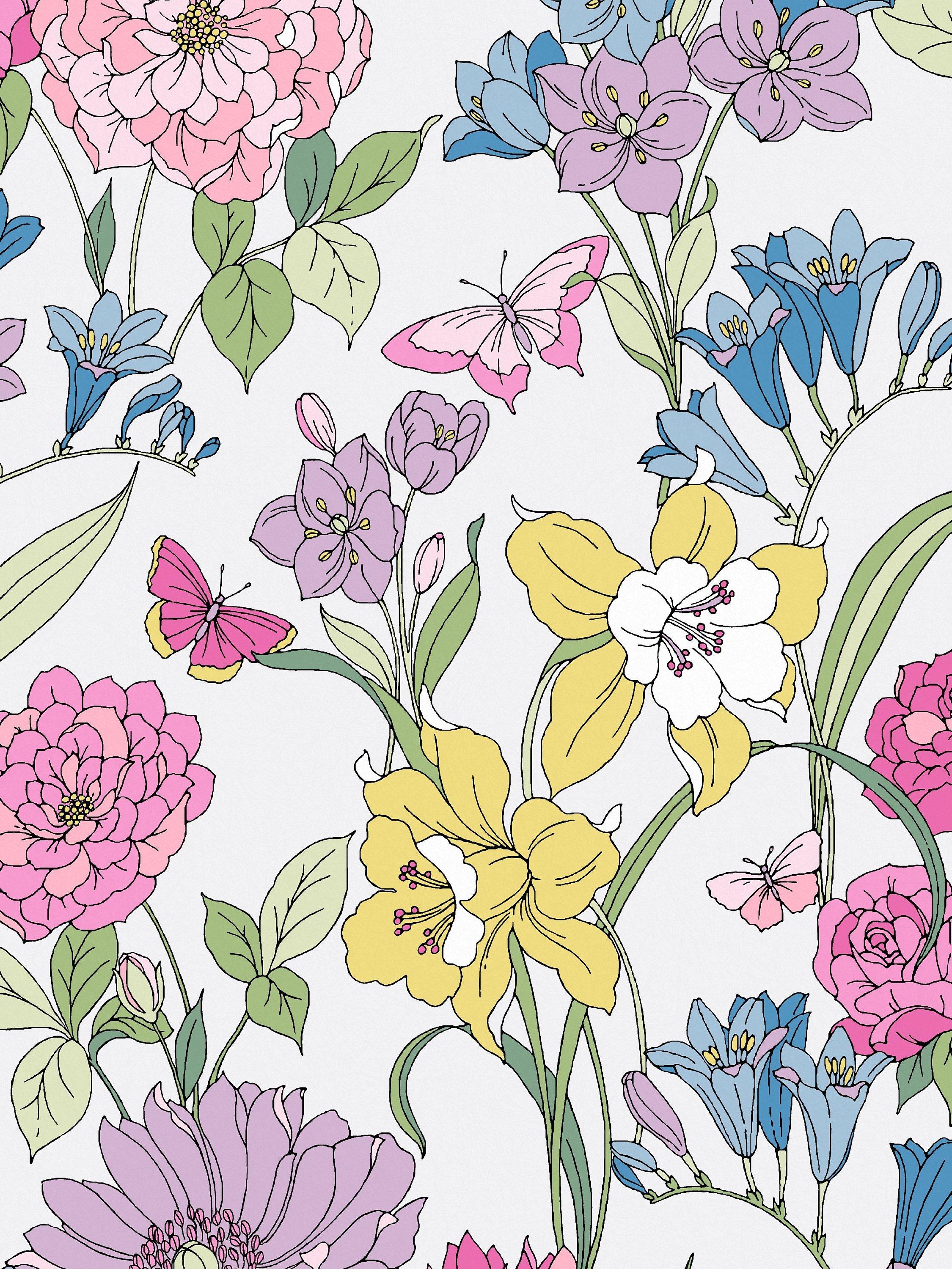 Laura Ashley Gilly Wallpaper Multi features a charming, line-drawn floral pattern inspired by original painted artwork. This stunning design captures many stylised blooms, like dahlias and daffodils, across its surface. It offers a delicate, artistic touch for enhancing any interior space.