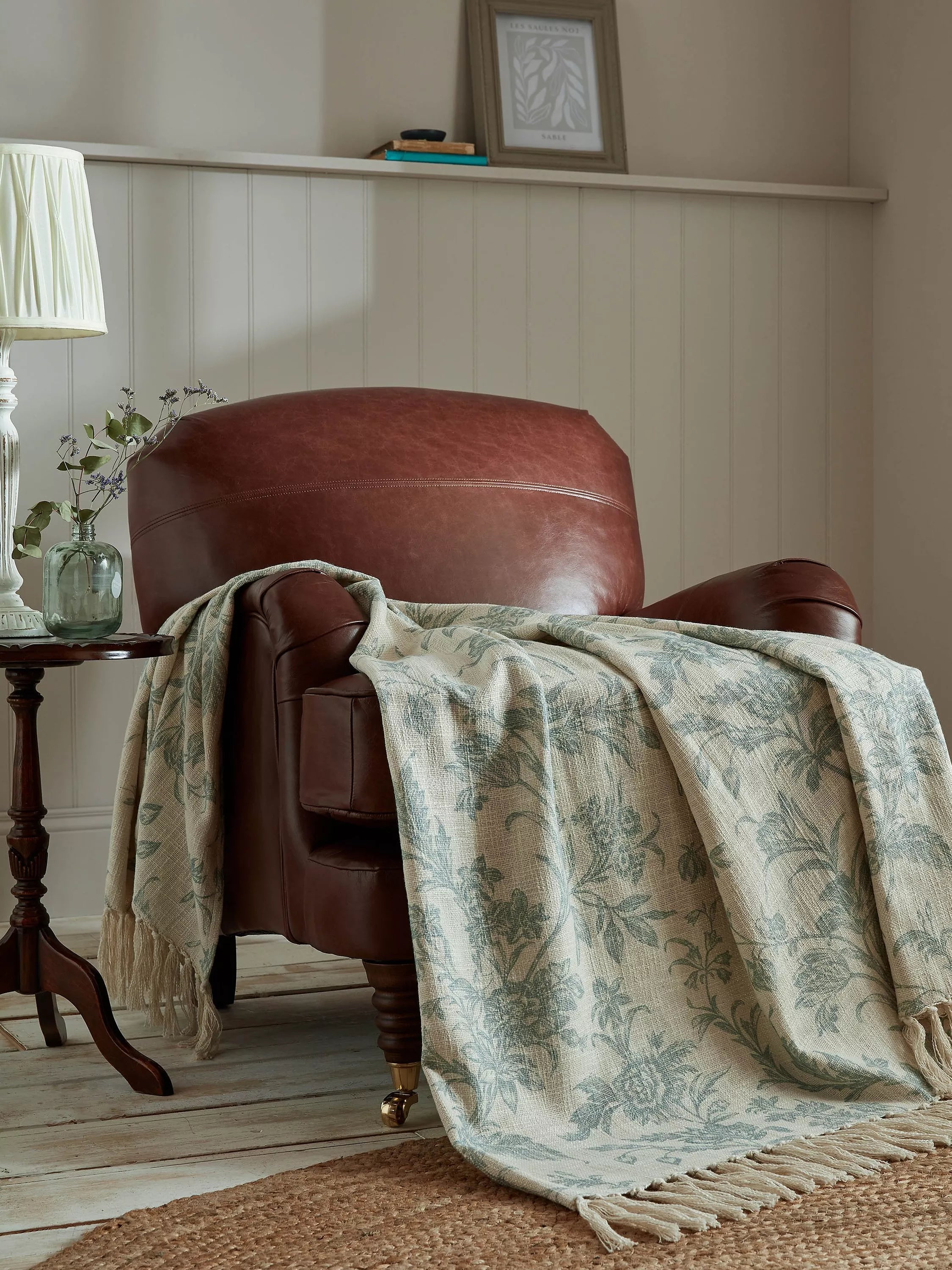 Das Lloyd-Muster ist ein filigranes Blumenmotiv mit romantisch geschwungenen Blütenstängeln von Tulpen, Primeln und Fingersträuchern. Fein auf Baumwolle gedruckt und mit attraktiven Noppen versehen, ist diese wunderschöne Baumwolldecke eine stilvolle Bereicherung für Ihr Zuhause.