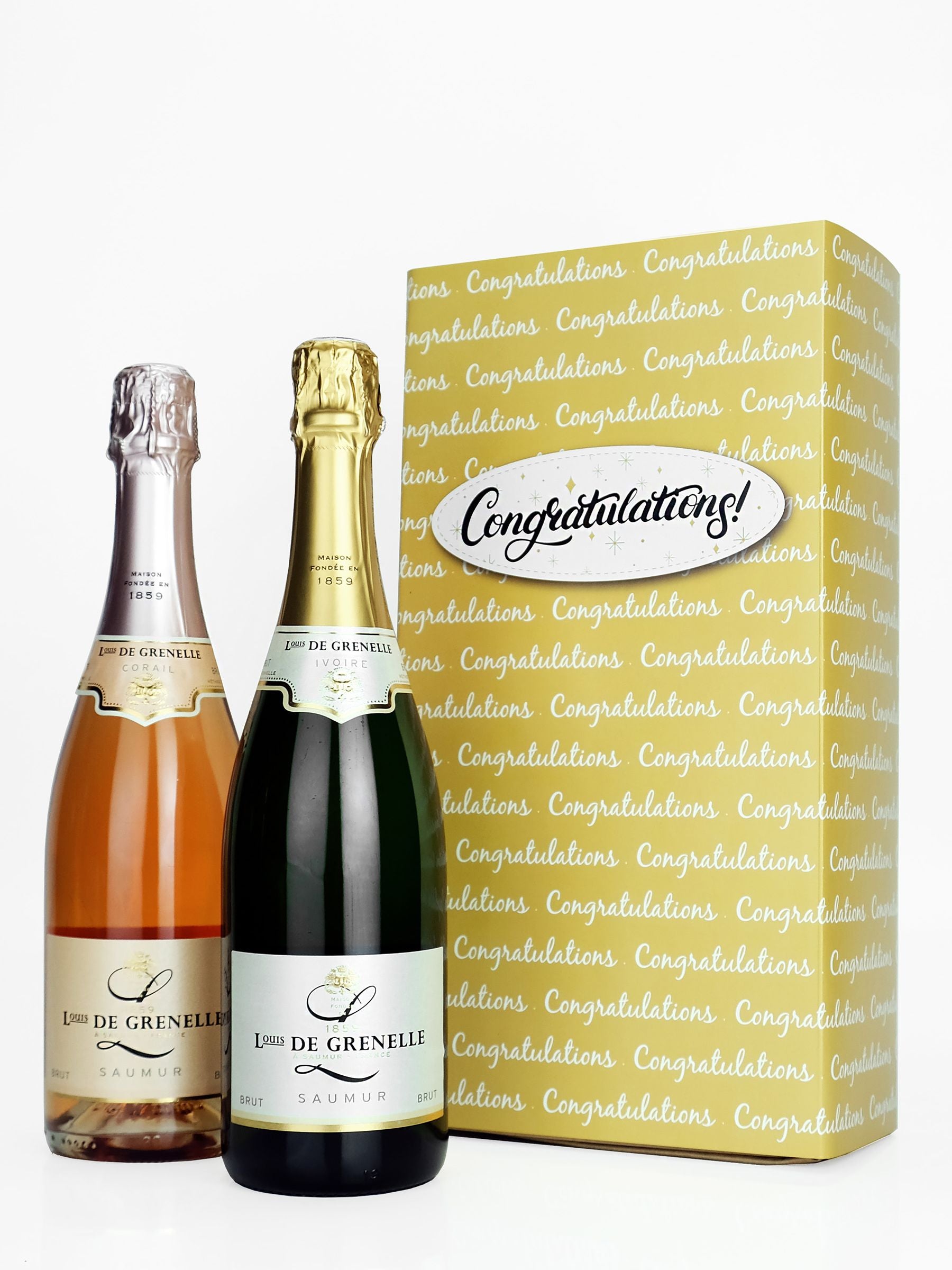 Celebrate success with a two bottle French sparkling Saumur wine gift presented in a Congratulations themed gift box. These two sparkling wines are made with the Champagne method and offer great taste and exceptional value. Perfect for congratulating someone on their achievements, this gift is sure to be appreciated by anyone who loves sparkling wine. Volume 2x 750ml, ABV 12.0%.