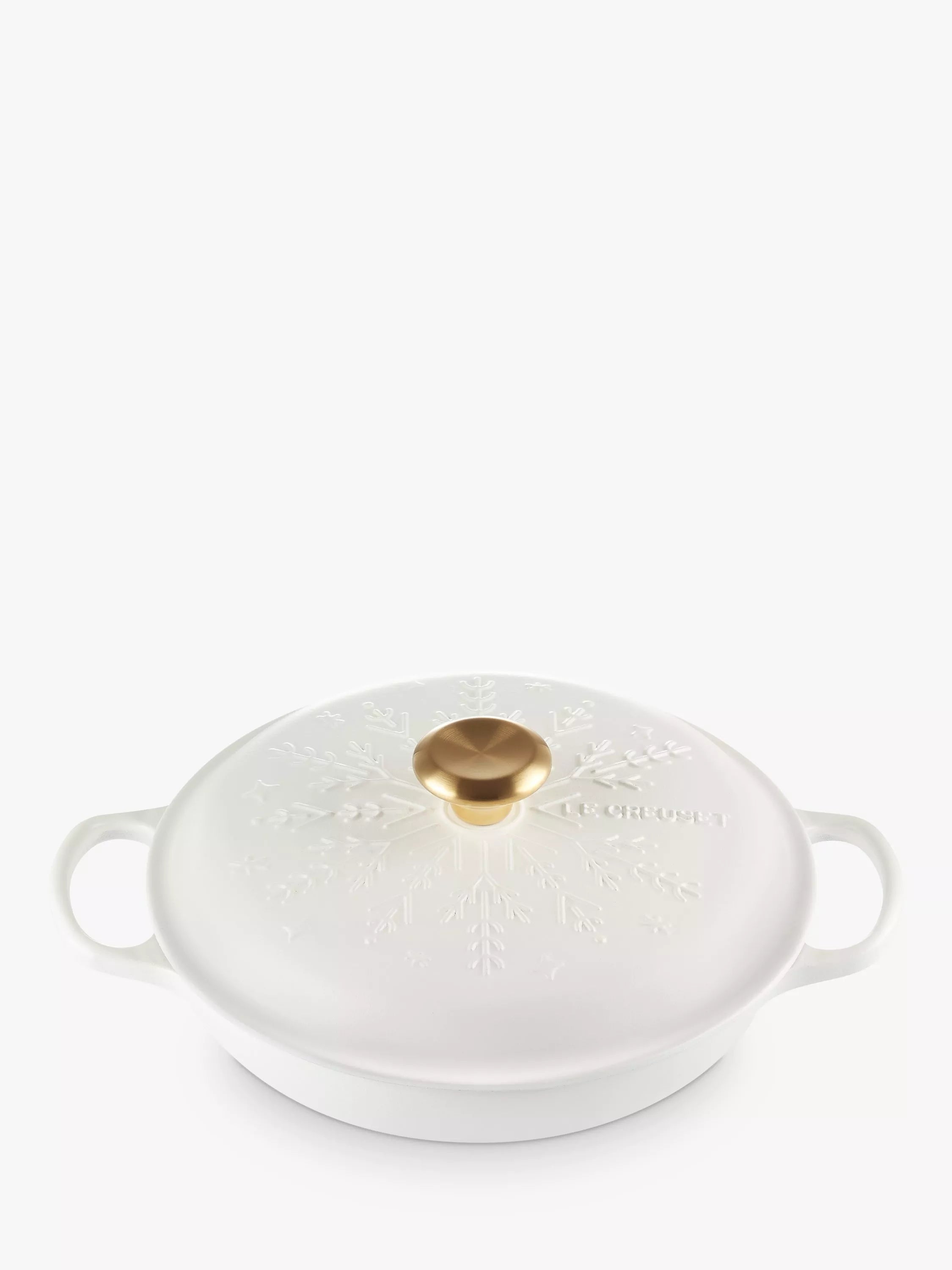 Die vielseitige, flache Kasserolle aus Gusseisen von Le Creuset im festlichen Schneeflockenmuster. Seit Generationen beliebt, ist diese Kasserolle ein echtes 4-in-1-Tafel: Sie eignet sich hervorragend zum Auflauf, Braten, Backen und Schmoren und ist zudem eine attraktive Servierschale.