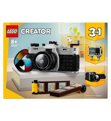 The LEGO Creator 3-in-1 Retro Camera Toy Set (31147) offers versatile building opportunities for creative builders aged eight and up. This engaging construction project allows you to build one of three different retro-themed media devices from the same selection of bricks. Experience extended playtime by transforming your creation as often as you like.
