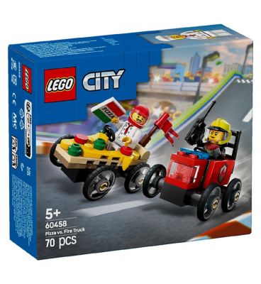 Introduce exciting urban competition with the LEGO City Pizza vs. Fire Truck Race Car Pack (60458) for builders aged five and up. Kids can set up an imaginative showdown between the chef minifigure riding a sizzling pizza slice and the firefighter in the rapid red fire truck toy. Who will win the urban race?