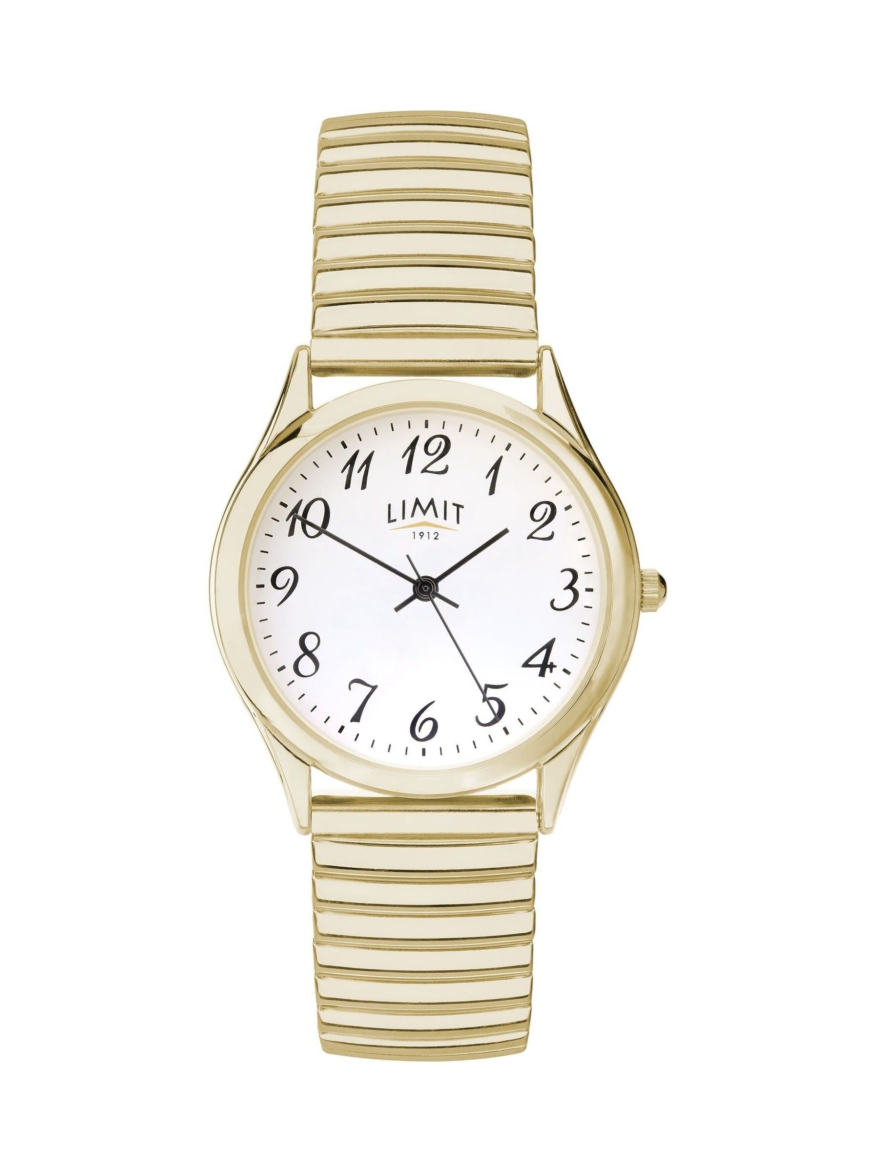 Diese Uhr verfügt über ein rundes, vergoldetes Gehäuse aus einer Legierung mit weißem Zifferblatt. Sie wird mit einem vergoldeten Edelstahlarmband mit Dehnungsmechanismus befestigt.