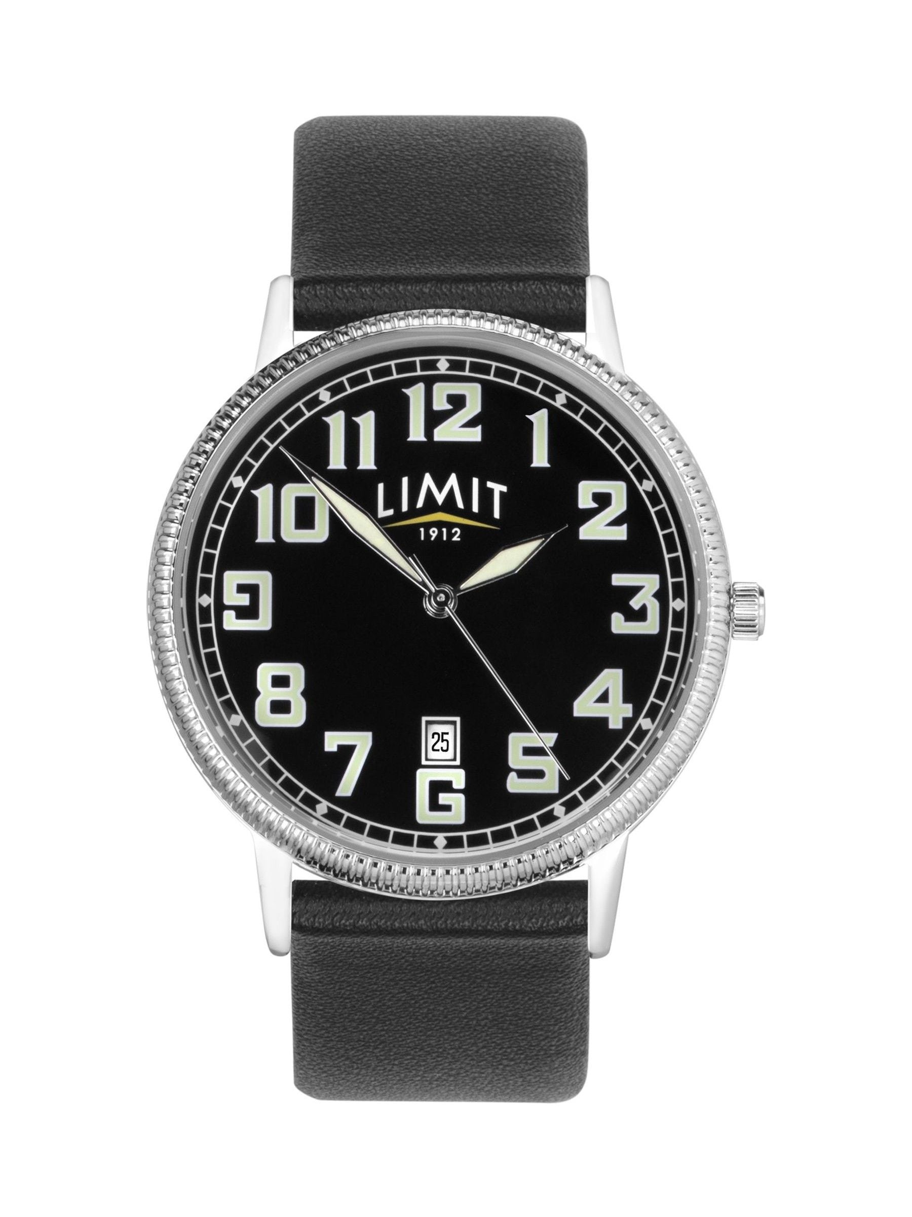 Diese Herrenuhr wird mit einem schwarzen, gepolsterten PU-Armband geschlossen. Sie verfügt über ein rundes, silberplattiertes Gehäuse aus einer Aluminiumlegierung, ein schwarzes Zifferblatt und eine Datumsanzeige.