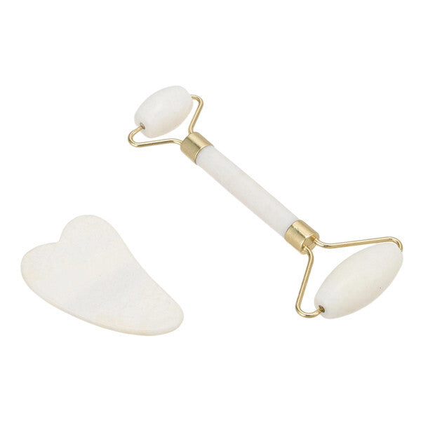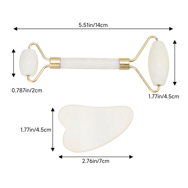 This set includes two smoothly polished tools designed for daily skincare routines. The gua sha and jade roller are crafted to firm the skin, reduce puffiness, and naturally relieve facial tension for a healthy glow. These implements offer a chemical-free approach to facial care, focusing on physical techniques for skin wellness.