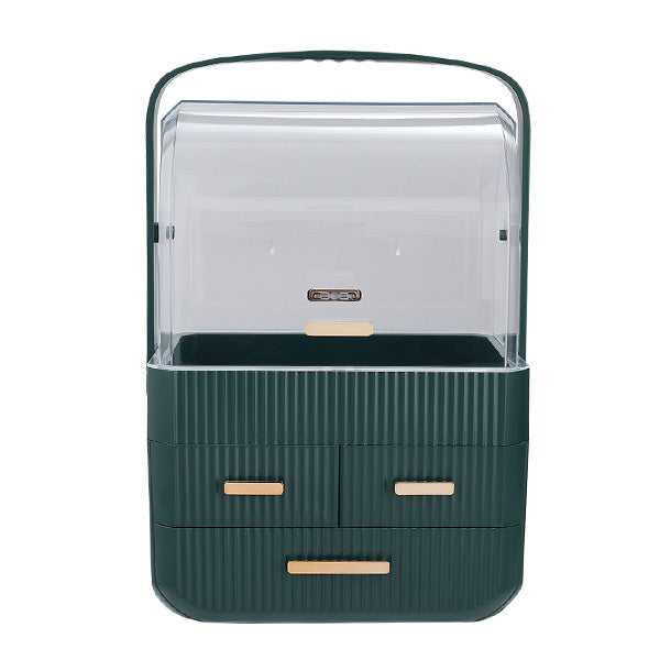 Der transparente Deckel schützt Ihre Kosmetiksammlung vor Staub und hält sie sichtbar. Die robuste Kunststoffkonstruktion ist für den täglichen Gebrauch geeignet. Das geriffelte Äußere verleiht dem Organizer ein luxuriöses und modernes Aussehen. Spezifikationen: Abmessungen: 24,6 cm (B) x 18,6 cm (T) x 35,3 cm (H); Material: Kunststoff; Farbe: Grün; Anzahl der Schubladen: 3; Lieferumfang: 1 x Make-up-Organizer