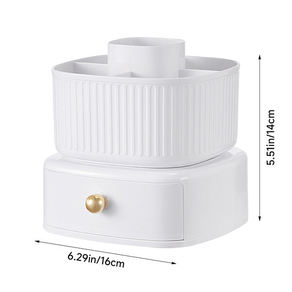 This swivel makeup organizer effectively combines versatile storage with easy functionality.
