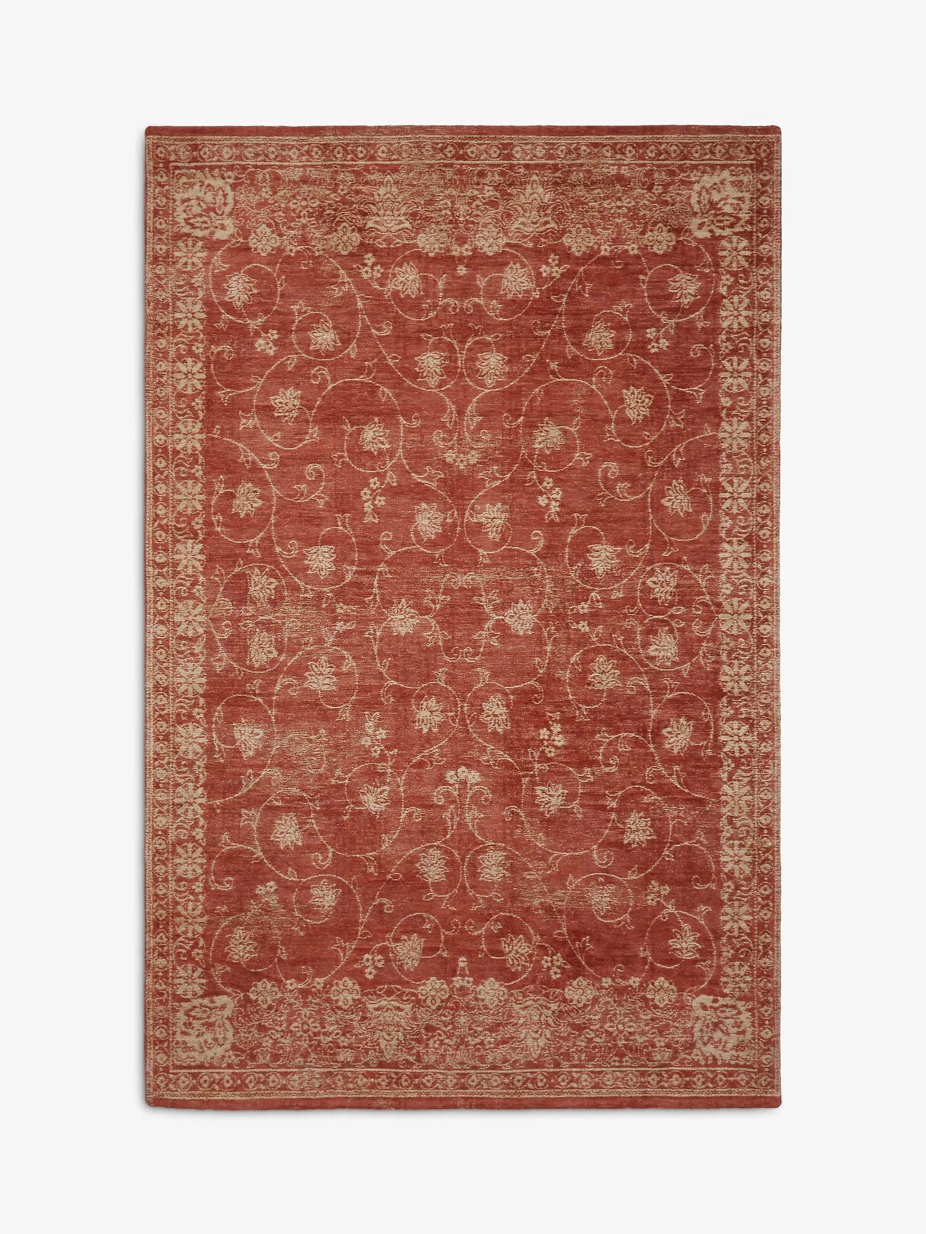 Dieser wunderschöne, flachgewebte Teppich im Vintage-Stil besticht durch ein traditionelles Blumenmuster in warmen Terrakotta-Tönen, das Ihrem Zuhause eine behagliche Atmosphäre verleiht. Dank seiner robusten Webart werden Sie lange Freude daran haben. Alle Teppiche von Louis de Poortere sind zu 100 % recycelbar.