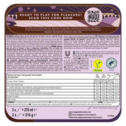 Experience the Magnum Chill Blueberry Cookie, spiralling into unparalleled pleasure with its unique combination of textures and tastes. This dessert features creamy vanilla biscuit ice cream built around an intense core of fruity blueberry sorbet.
