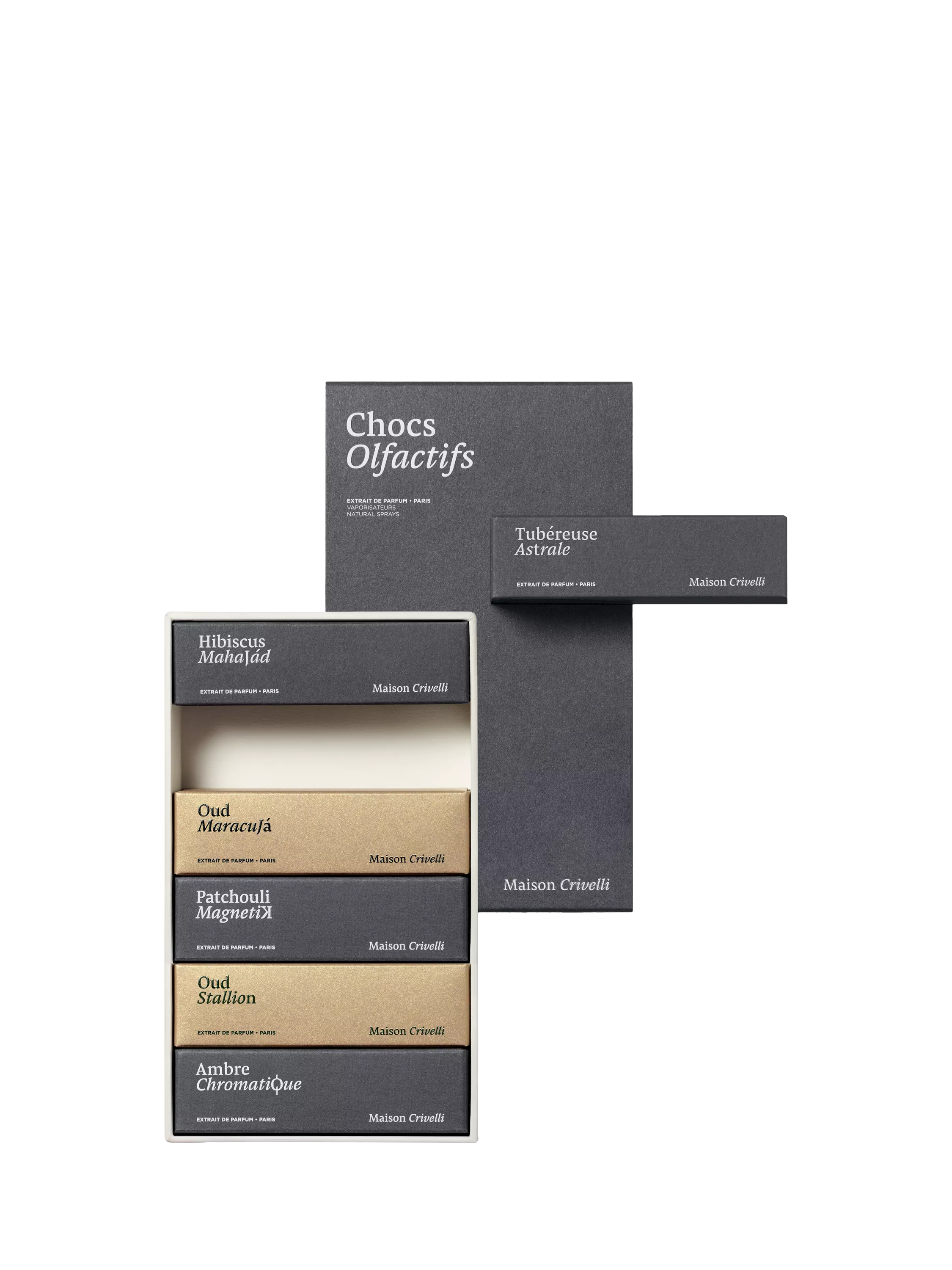 Unsere sechs Extraits de Parfum sind jetzt in einem neuen Set erhältlich, das eine Flasche Tubéreuse Astrale, Hibiscus Mahajád, Patchouli MagnetiK, Ambre Chromatique, Oud Maracujá und Oud Stallion enthält.