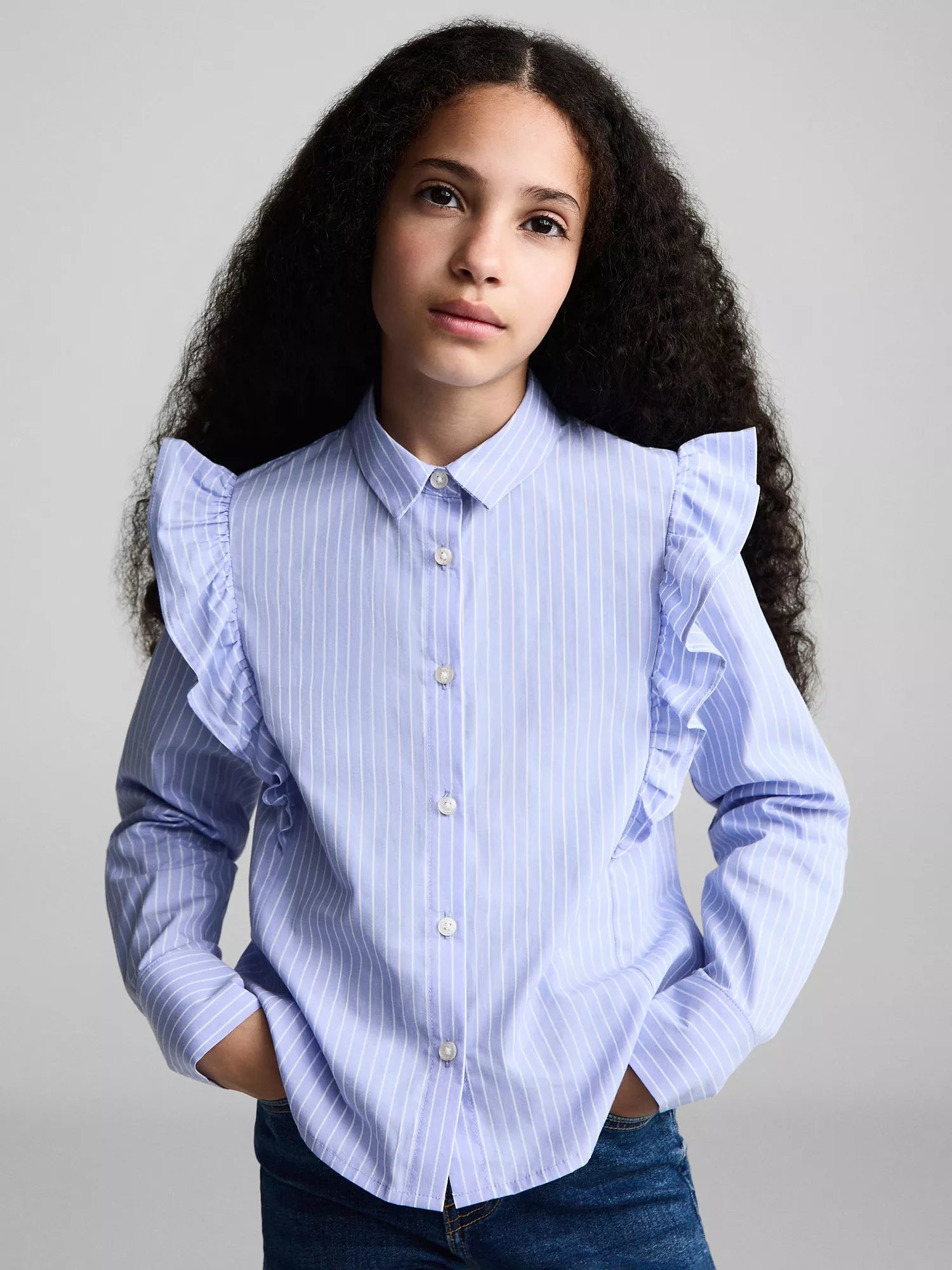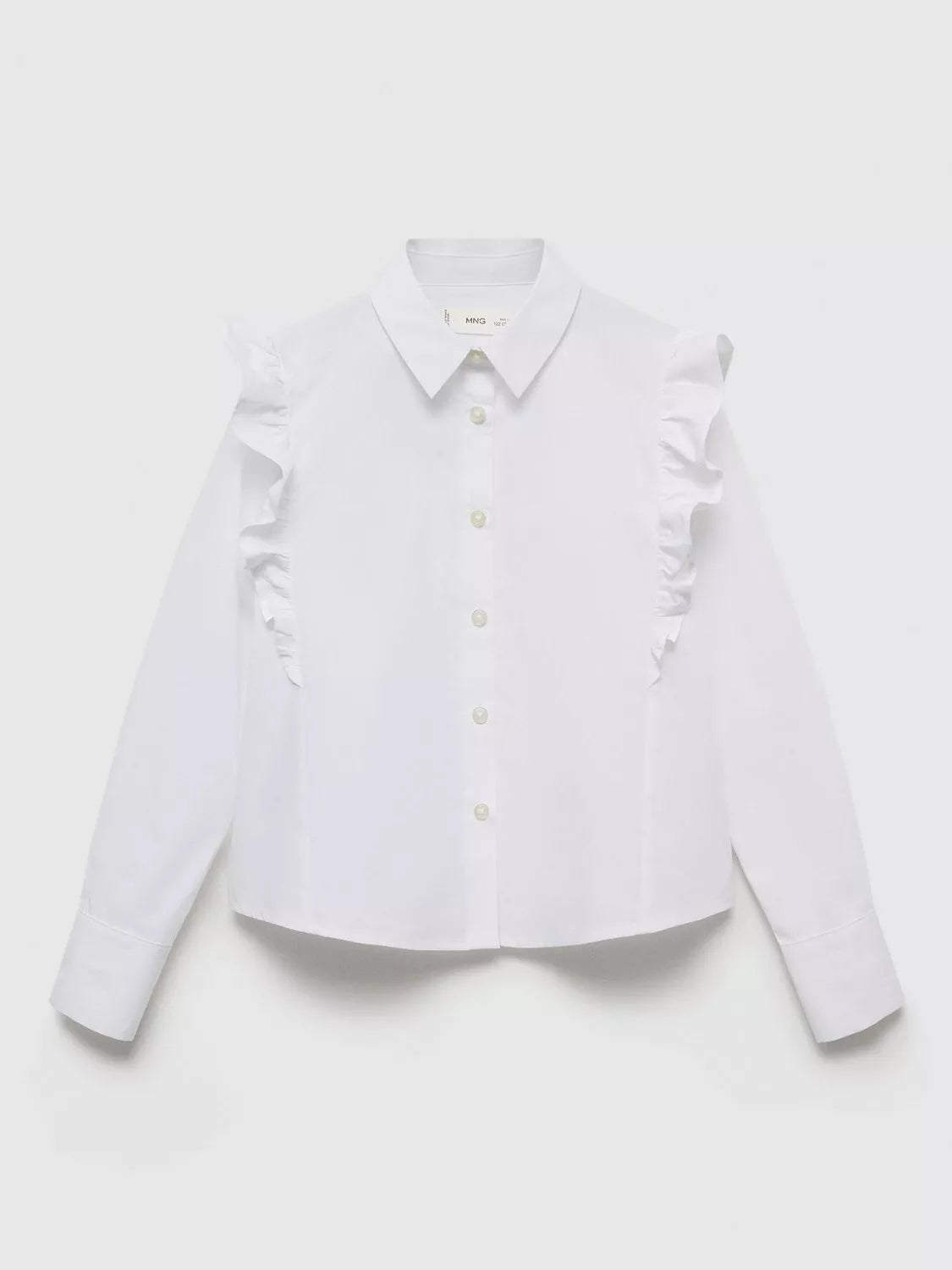 Diese elegante Bluse aus weicher Baumwolle besticht durch Rüschen an den Schultern. Sie eignet sich perfekt für festliche Anlässe und hat einen geraden Schnitt, lange Ärmel mit geknöpften Manschetten und einen schlichten Knopfverschluss vorne.