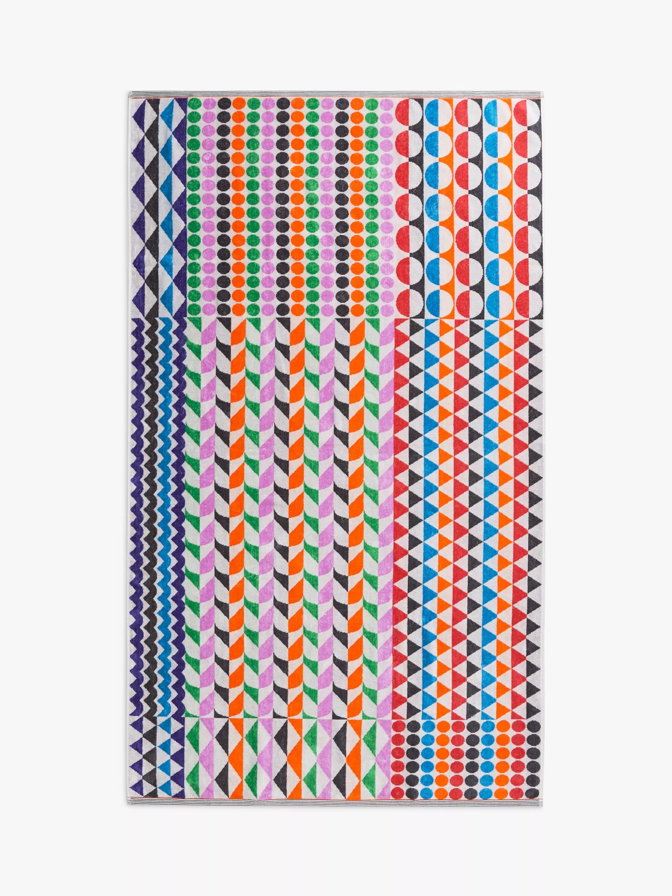 Das Quez-Strandtuch von Margo Selby zeichnet sich durch ein lebhaftes geometrisches Muster aus Ziehharmonikas, Wimpeln und Punkten in leuchtenden Farben aus, sodass es auf dem weitläufigen Strand gut zu erkennen ist.