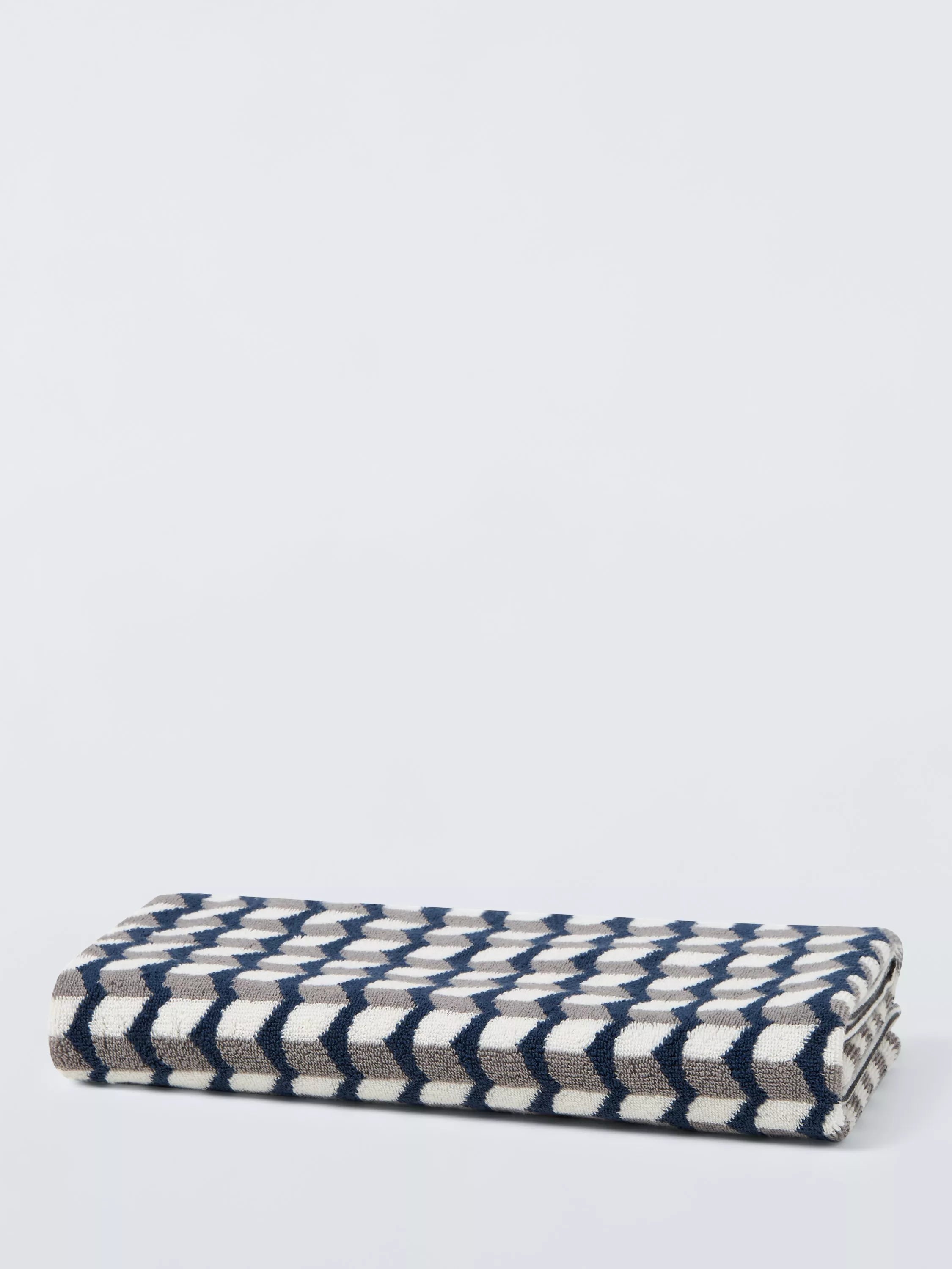 Das Southwold-Design ist ein auffälliges geometrisches Muster in Marineblau-, Weiß- und Grautönen.