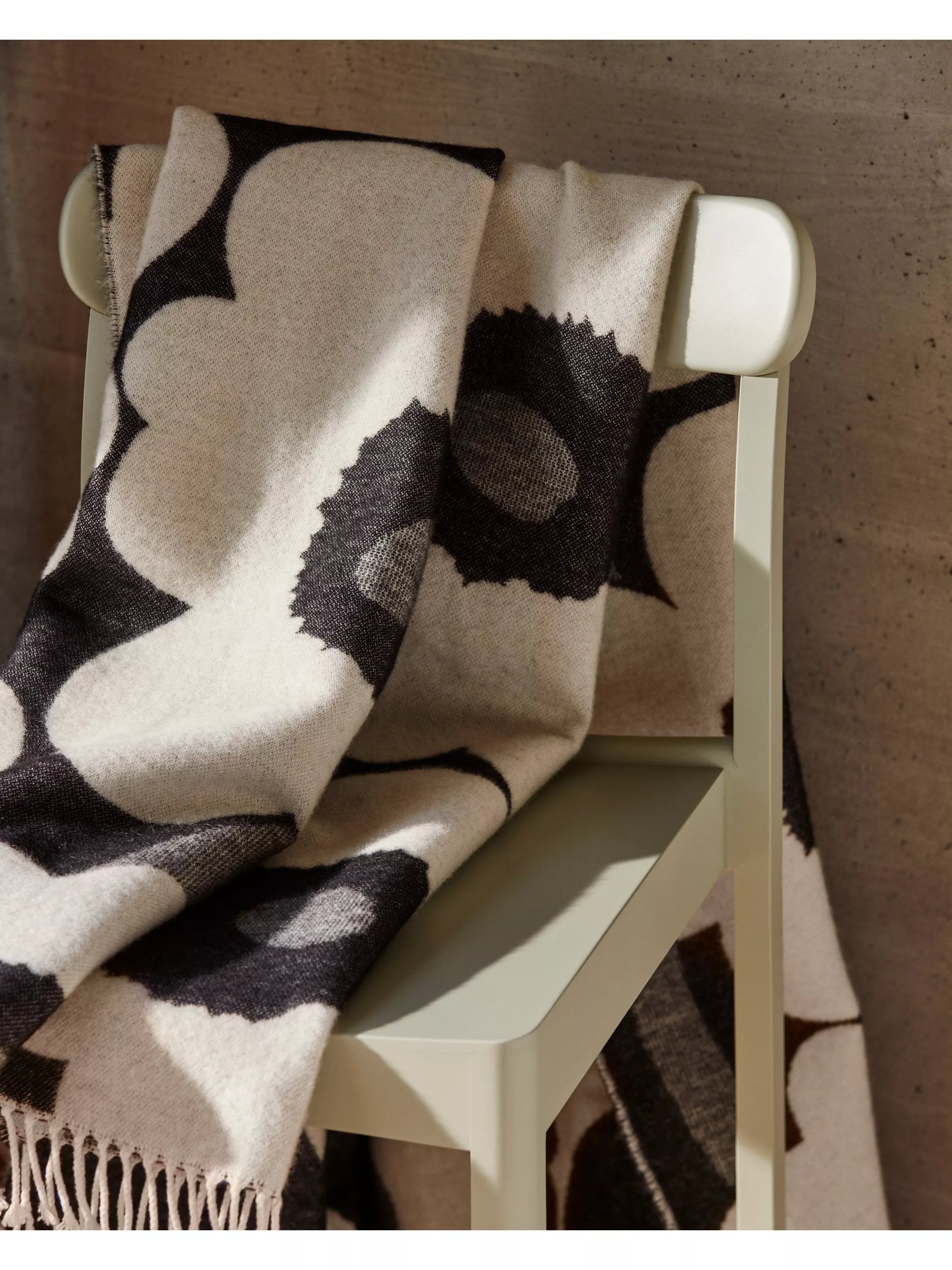 Diese wunderschöne Decke aus Woll-Baumwoll-Mischgewebe mit Fransen an den Enden hält Sie garantiert warm. Sie ist mit dem klassischen schwarz-weißen Unikko-Muster verziert und beidseitig verwendbar, wobei die Rückseite ein raffiniertes Farbnegativ der Vorderseite darstellt.