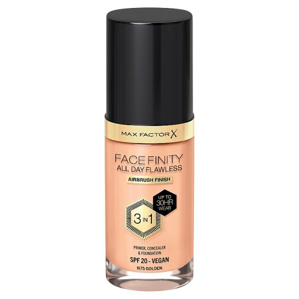 This Max Factor Facefinity foundation offers a 3-in-1 formula combining primer, concealer, and foundation for a flawless look. Its lightweight, breathable vegan formula provides coverage for imperfections and redness. This product is designed for extended wear, offering up to 30 hours of durability.