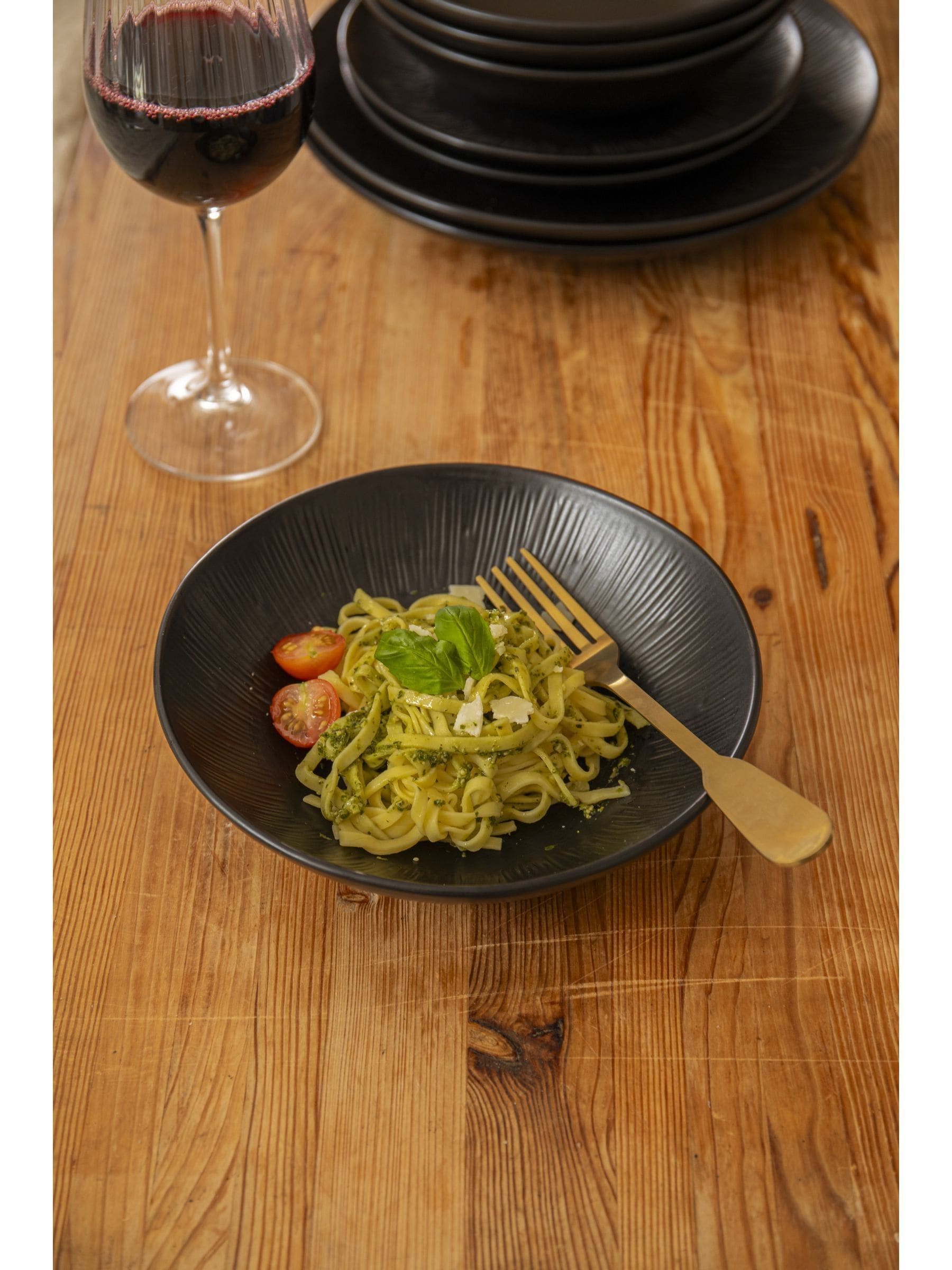 • Enthält 4 schwarze Pastaschalen aus der Mikasa Jardin Midnight Kollektion • Entworfen in Großbritannien, mit tiefschwarzer Glasur und einer von der Natur inspirierten, geprägten Textur • Das robuste Steinzeug macht sie ideal für besondere Anlässe oder den täglichen Gebrauch • Mikrowellen- und spülmaschinenfest für einfaches Aufwärmen und Reinigen • Dieses Keramik-Pastaschalen-Set ist ein ideales Hochzeits- oder Einzugsgeschenk und kommt mit 10 Jahren Garantie. Als Teil der Mikasa Jardin Midnight Kollektion ist dieses 4-teilige Pastaschalen-Set wie geschaffen für Mahlzeiten im Freien. Servieren Sie frische Pastasalate unter der Sonne – oder heizen Sie den Kaminofen an und genießen Sie ein Abendessen im Mondschein. Jede Schale wurde im britischen Studio von Mikasa entworfen und besticht durch eine tiefschwarze Glasur und eine ansprechende, geprägte Textur. Hergestellt aus robustem, spülmaschinen- und mikrowellengeeignetem Steinzeug. Entdecken Sie die Kollektion und stellen Sie sich eine individuelle Auswahl an Outdoor-Essgeschirr zusammen. Durchmesser (je): 20 cm