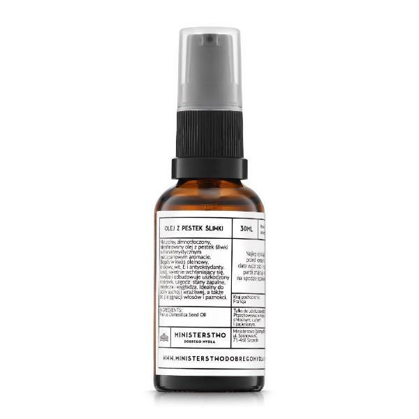 Pflaumenkernöl, reich an Ölsäure, Linolsäure und Vitamin E, zieht schnell ein, duftet nach Marzipan, spendet intensive Feuchtigkeit, beruhigt trockene Haut, schützt vor Feuchtigkeitsverlust, reduziert Hautunreinheiten und pflegt Spliss und brüchige Nägel.