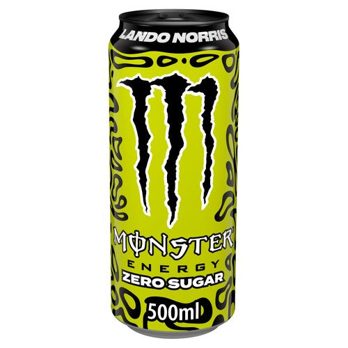 This specific Monster Energy drink is a collaboration celebrating Formula 1 driver Lando Norris, featuring his distinct helmet design on the 500ml can. It is a carbonated beverage designed to deliver substantial energy without the added sugar content found in standard formulations.