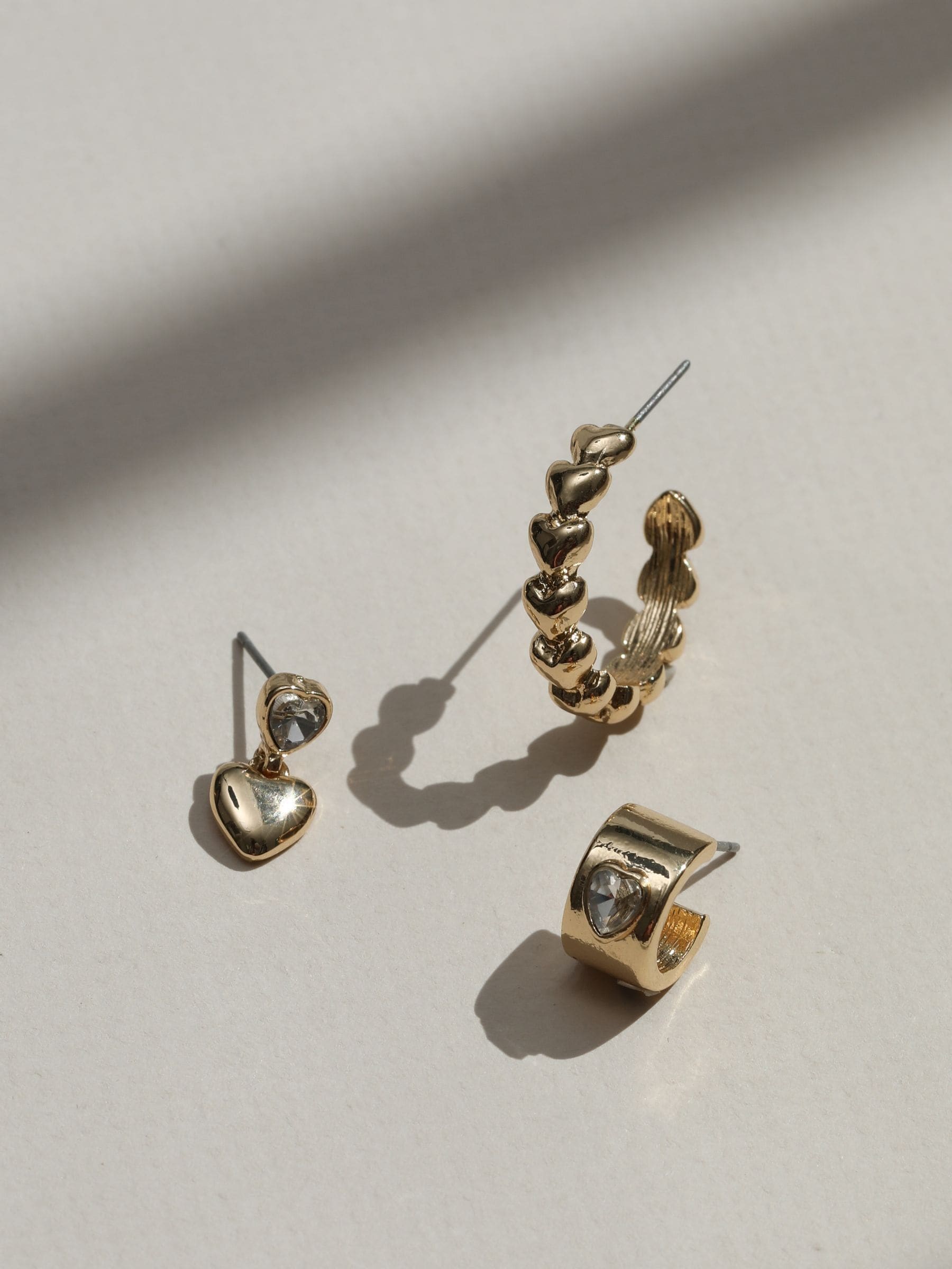 Unsere Mood Gold Polished & Crystal Heart Ohrringe vereinen Romantik und Stil perfekt. Jedes Paar besticht durch sein poliertes Design und funkelnde Kristalle, die jedem Look einen Hauch von Glamour verleihen. Tragen Sie sie einzeln oder kombinieren Sie sie nach Lust und Laune. Verschluss: Stecker mit Kugelverschluss. Breite: 8 mm, 7 mm, 5 mm. Länge: 15 mm, 15 mm, 13 mm. Material: Vergoldetes Basismetall.