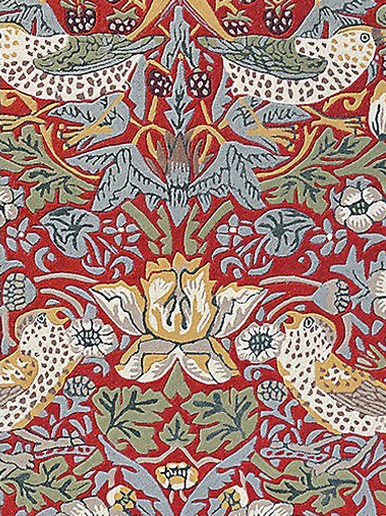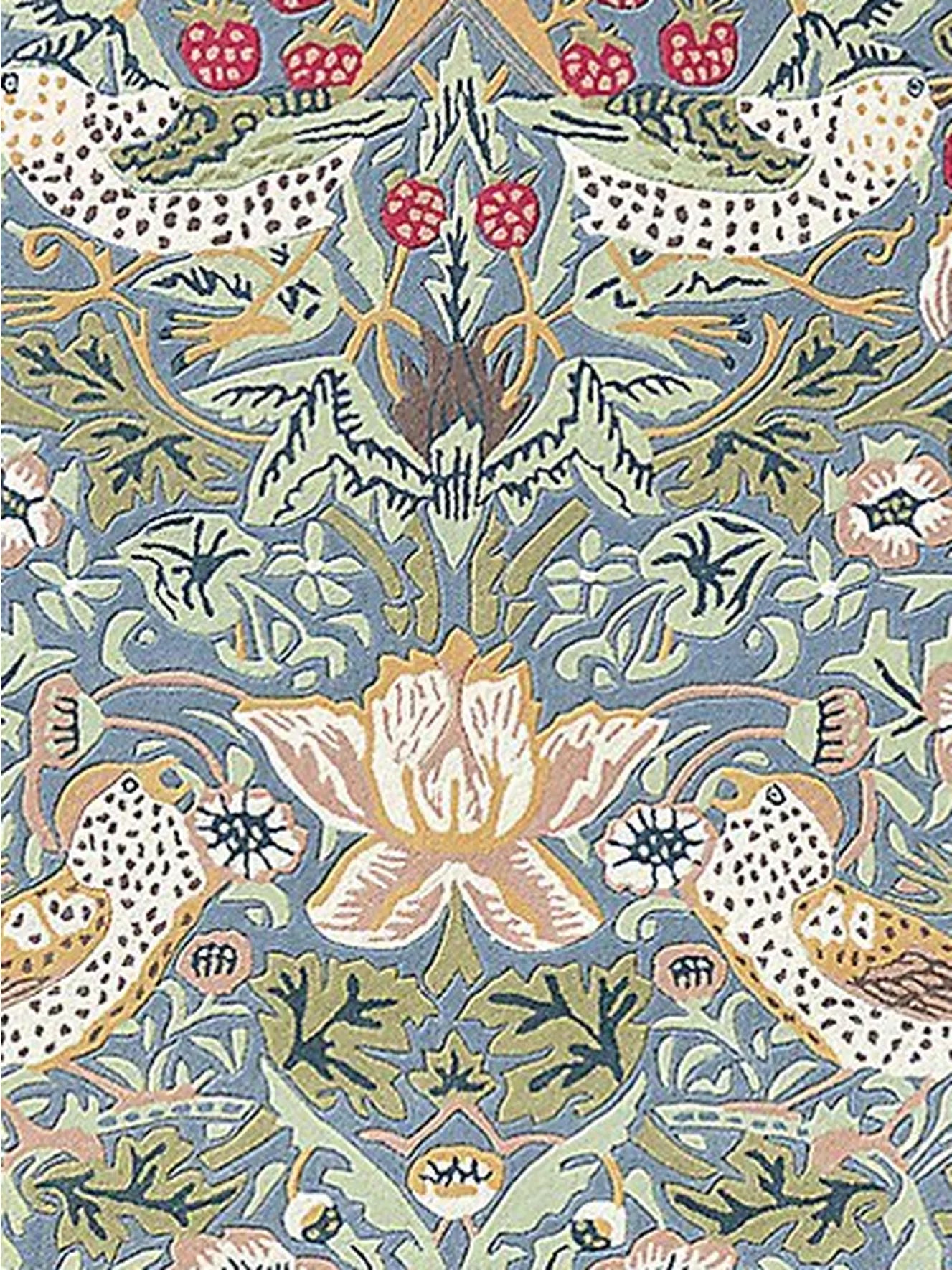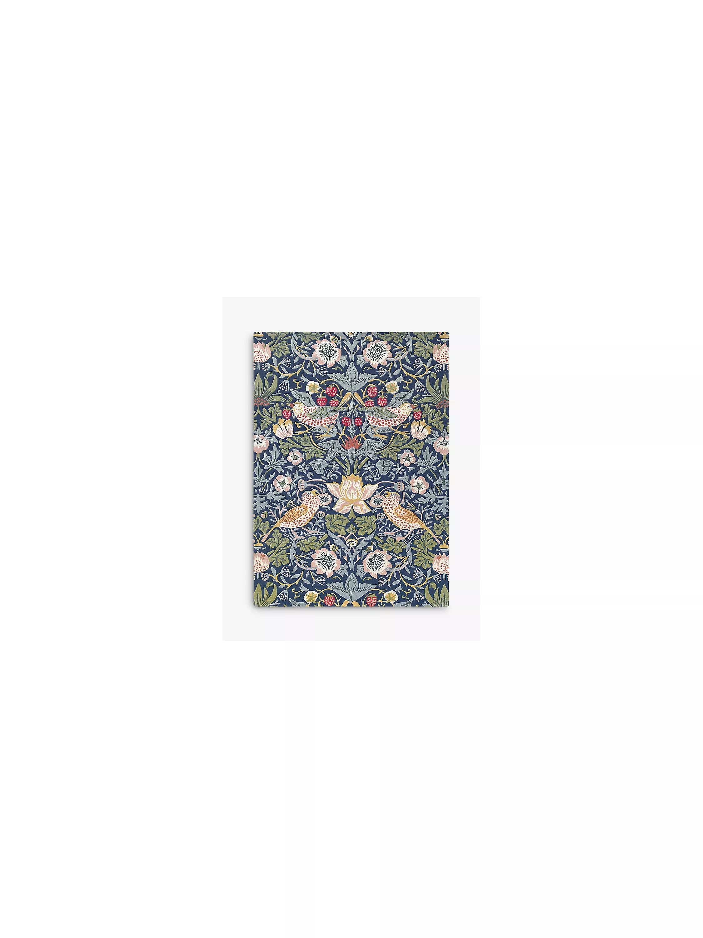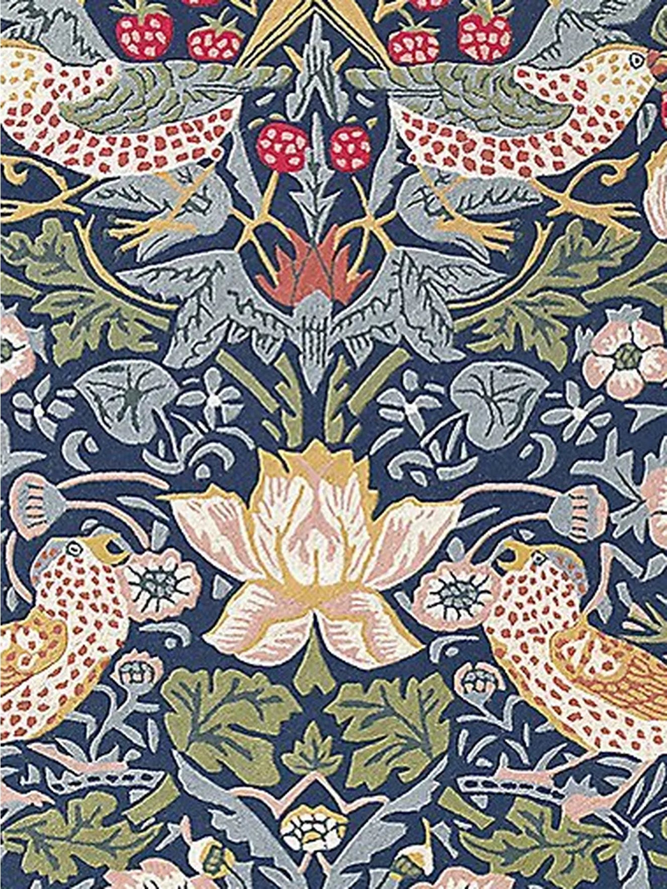 Das Design „Strawberry Thief“, ein klassischer Druck, wurde als Teppich neu interpretiert und zeigt freche Vögel, die Erdbeeren stehlen, vor einem wunderschön gestalteten Hintergrund, der von der Schönheit der Natur inspiriert ist.