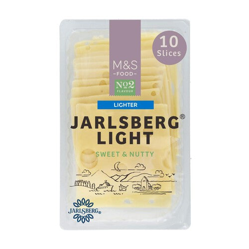 Enjoy the distinctively sweet and nutty profile of M&S Jarlsberg Light cheese. This selection offers 10 pre-sliced portions, ideal for quick, everyday use. It is a flavourful, lighter option suitable for vegetarian diets.
