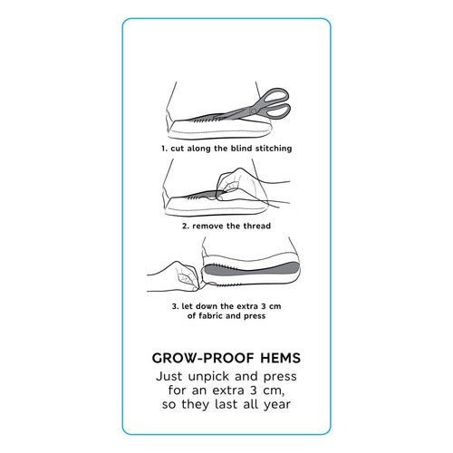 • Features adjustable hems, allowing the fit to grow with the child.